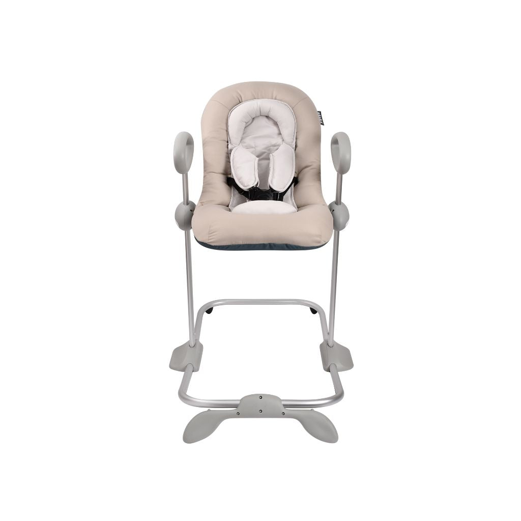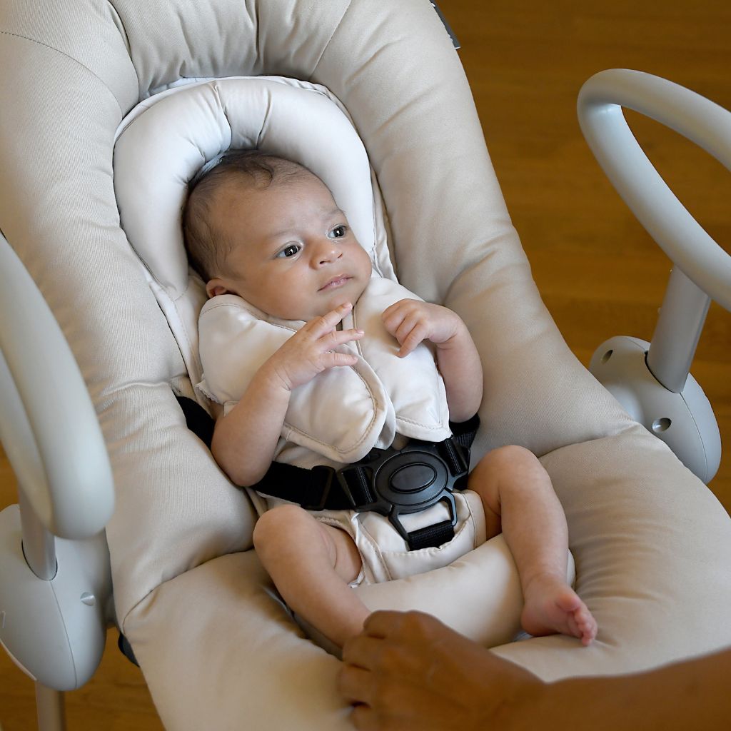 • Pour plus de sécurité, le transat est équipé d'un harnais de sécurité à 5 points réglable et d'une structure stable avec des zones antidérapantes.