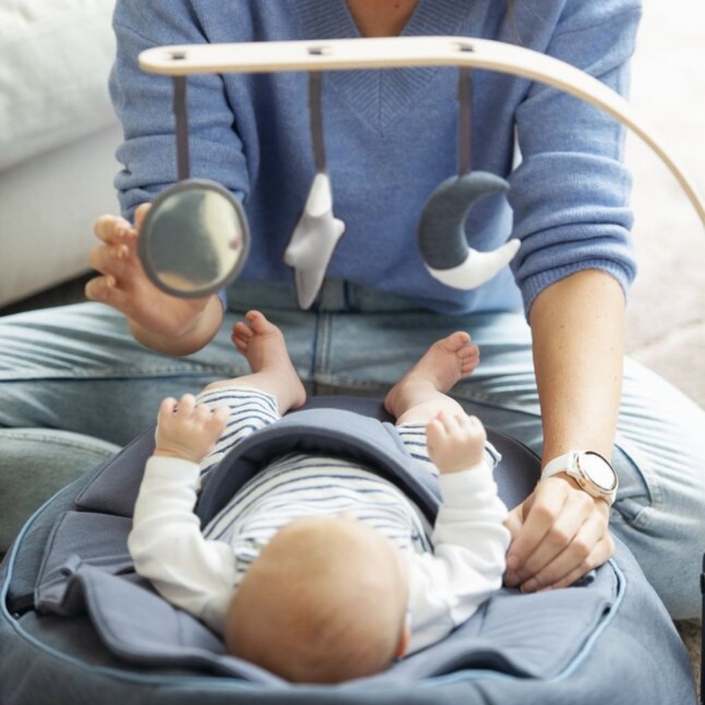 - Comprend 3 jeux amovibles : le contraste foncé/blanc des jouets et le miroir permettent de développer la perception visuelle de Bébé, tandis que le bruissement de la lune et de l'étoile favorise l'éveil auditif de votre enfant.