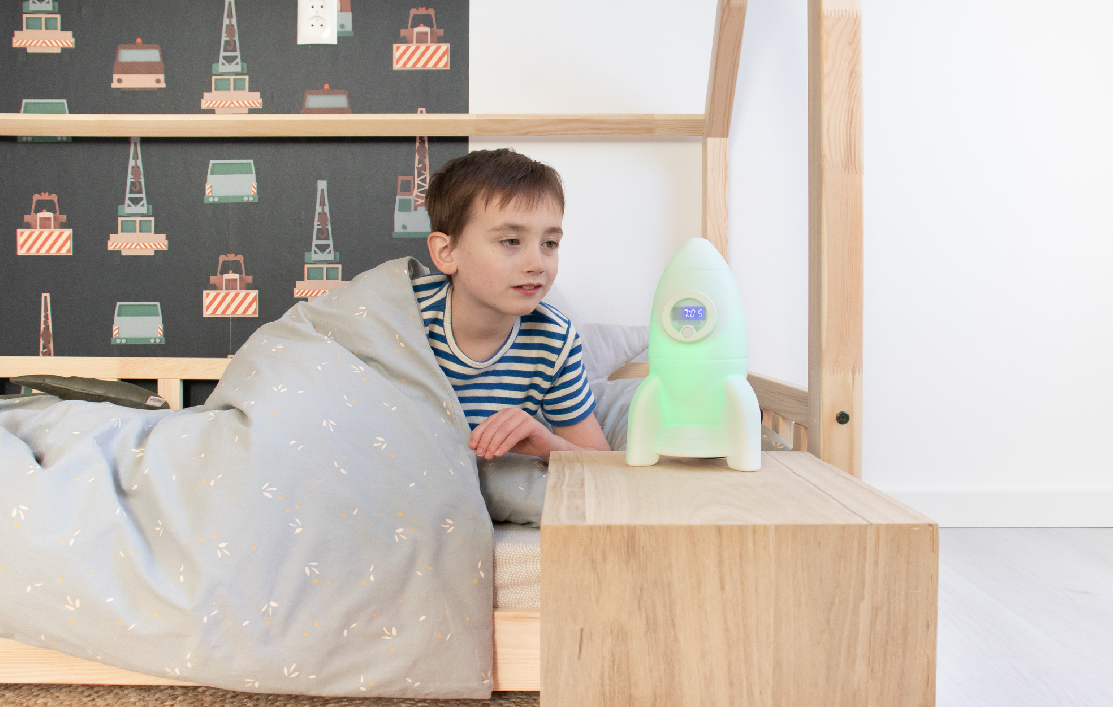 Change de couleur.- L'entraineur de sommeil apprend à votre enfant quand il est l'heure de se lever et d'aller dormir.- La fusée peut changer de couleur : orange quand il n'est pas encore temps de se lever, vert quand il est l'heure de sortir du lit.