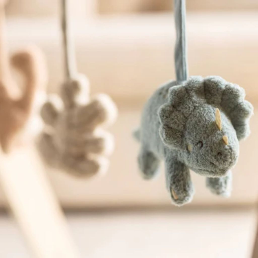 - 3 jouets suspendus : 2 dinosaures adorables et 1 feuille.- En tissu super doux à toucher.