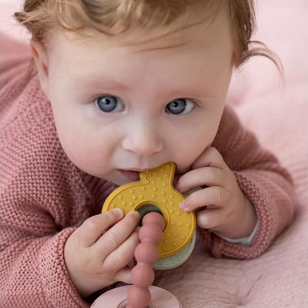 Stimuleert de fijne motoriek.- Verlicht de pijn in het tandvlees als de eerste tandjes erdoor komen.- Multifunctioneel: gebruik het als speeltje of bijtring!
