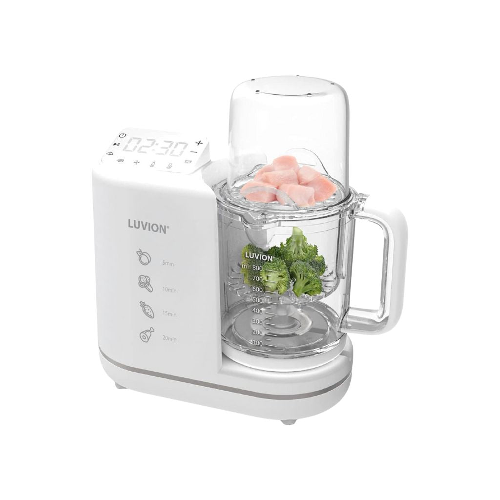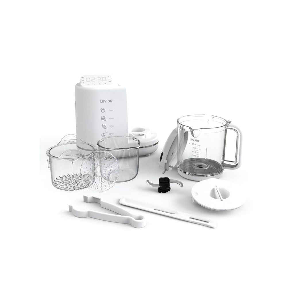 Découvrez le LUVION® BabyBlend+ 6-en-1 en blanc : votre partenaire pour une alimentation saine pour bébé. Cuisson à la vapeur, mixage et plus encore - lavable au lave-vaisselle.