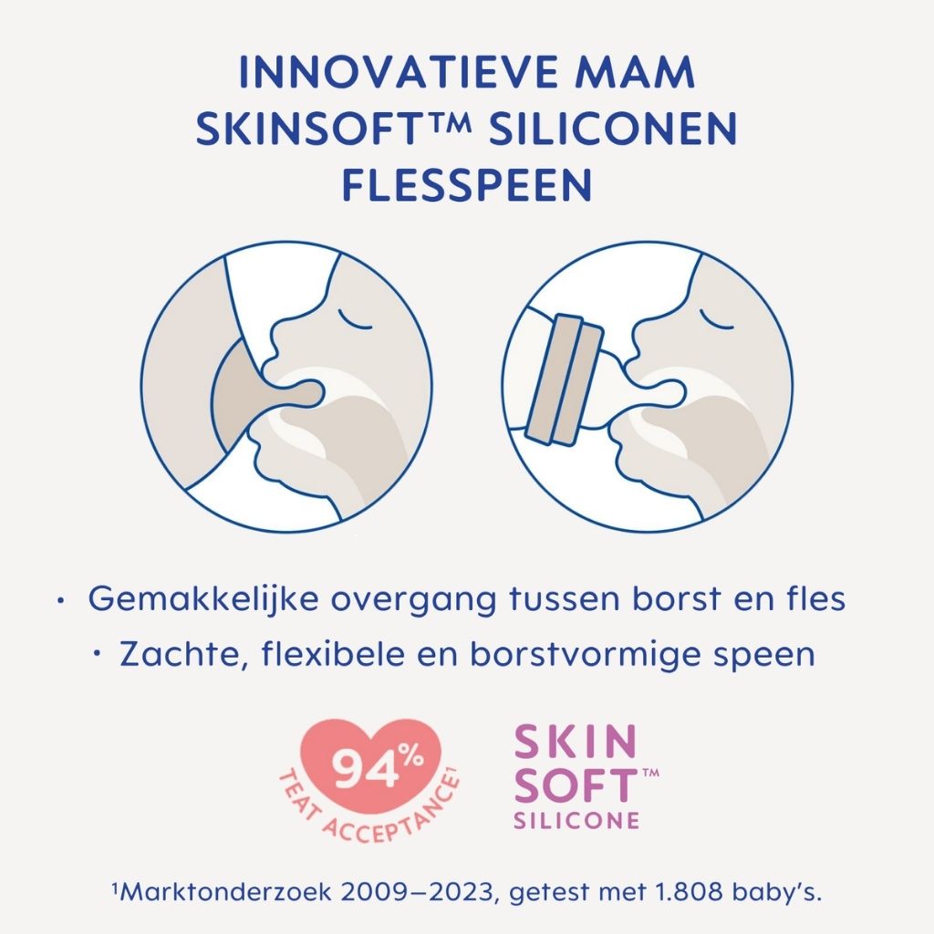 La tétine MAM n° 0 a été spécialement conçue pour offrir à votre bébé une sensation aussi naturelle que possible pendant l'allaitement. Le silicone SkinSoft™ innovant est non seulement doux au toucher, mais il est également accepté par 94 % des bébés, ce qui rend la transition du sein au biberon facile et sans effort. Cette tétine simule exceptionnellement bien la forme et la souplesse du sein maternel, ce qui permet à votre bébé de téter instinctivement.