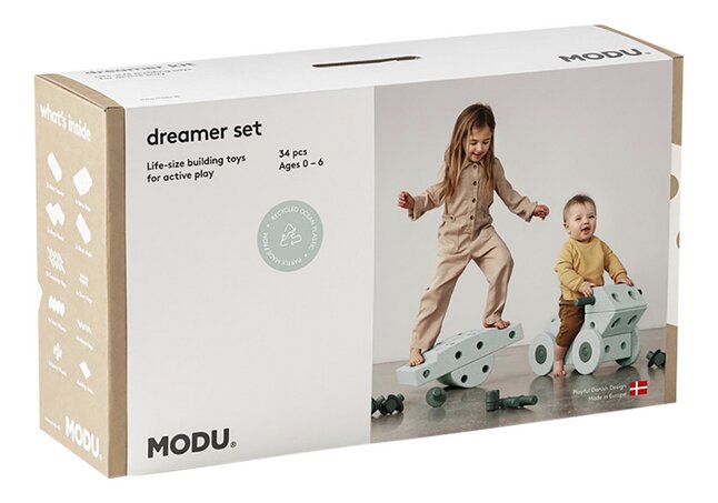 Plus de 12 possibilités de construction. Avec le kit Dreamer de Modu, vous et votre enfant construisez plus de 12 créations uniques en taille réelle avec lesquelles votre petit bout pourra rouler, tourner, jouer, sauter, danser… Le plaisir commence avec la construction et ne se termine... jamais ! Modu grandit avec votre enfant d'année en année.