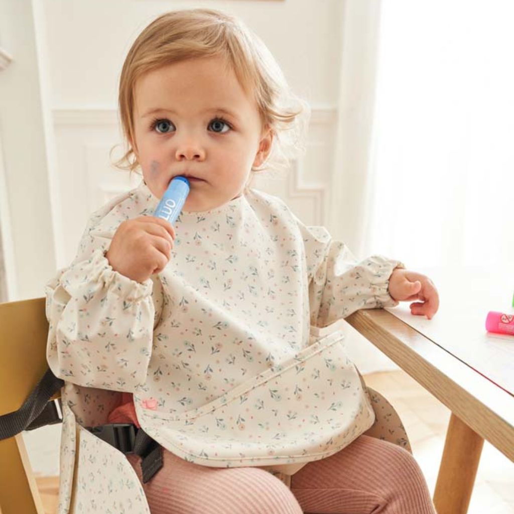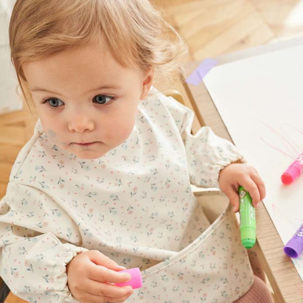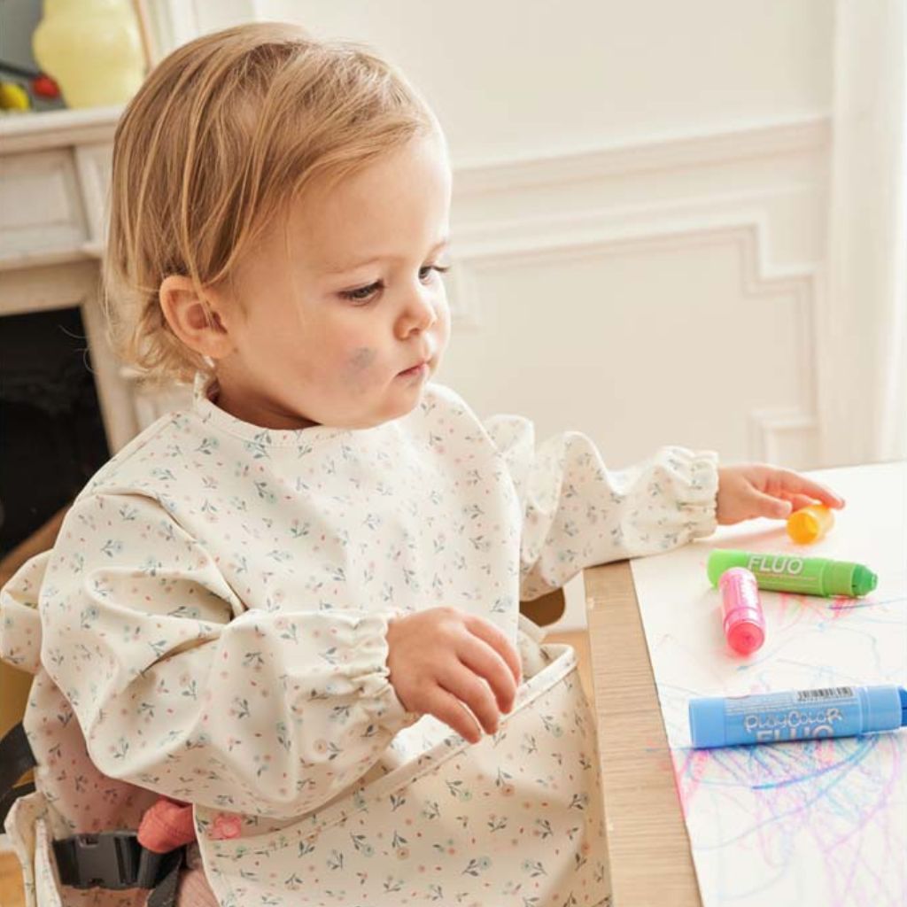 Comfortabel & supergemakkelijk aan- en uit te trekken.- Weg met die vlekken: uit waterdichte stof.- Met elastisch bandje aan de polsen: voor een goede pasvorm & veel bewegingsvrijheid.