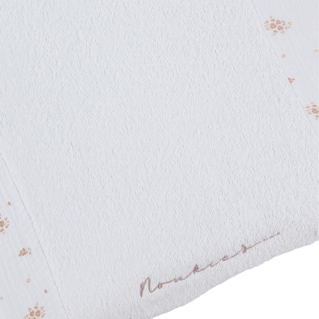 Housse de matelas à langer douce Noukie's à fleurs vintage, blanche. Offre confort et hygiène, lavable en machine. Parfaite pour chaque changement de couche.