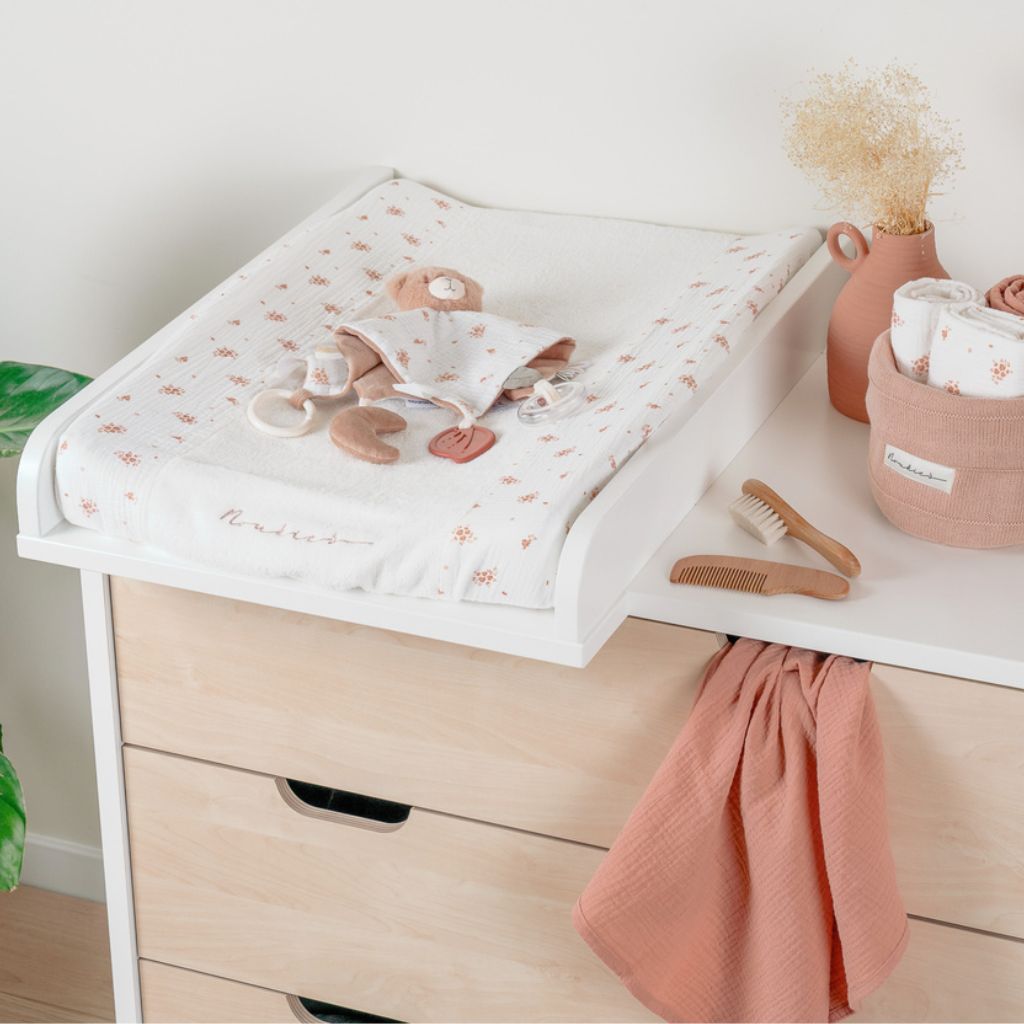 C'est l'heure du changement de couche ? Transformez cette routine en un moment de tendresse avec la housse de matelas à langer Noukie's de la collection Vintage Flowers. Cet article n'est pas seulement un régal pour les yeux, mais grâce à son tissu éponge épais, il est également très doux pour la peau de votre bébé. Conçu pour offrir à la fois confort et hygiène, chaque changement de couche devient un moment de calme et de sécurité. Laissez votre tout-petit profiter de la douceur du 100 % coton, tandis que vous appréciez la commodité et la durabilité de cet accessoire de soin indispensable.