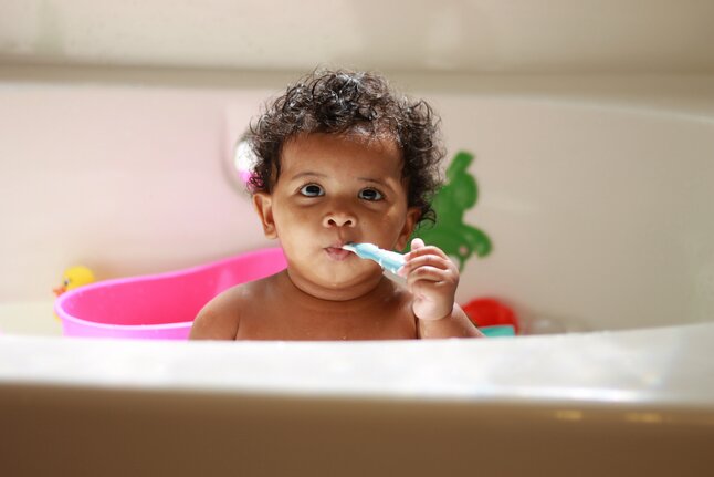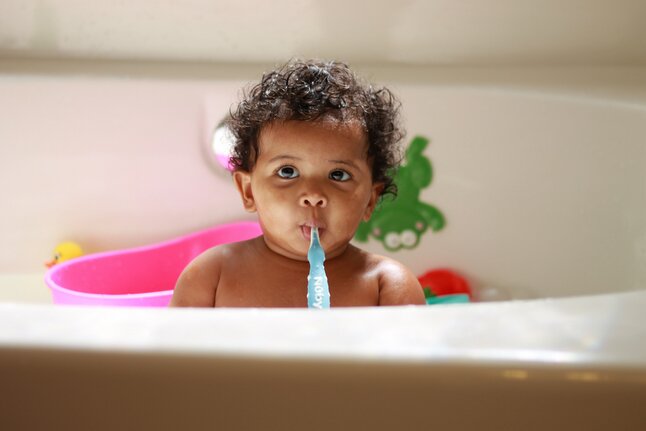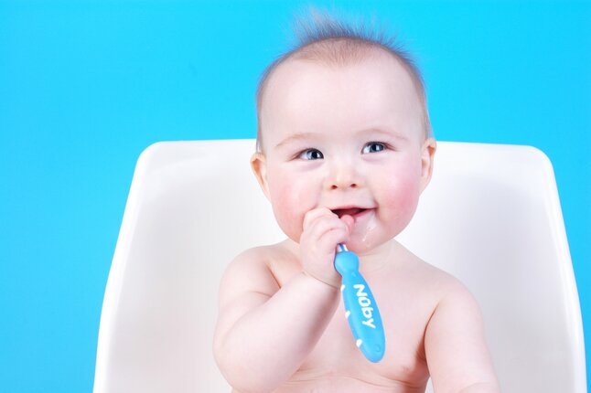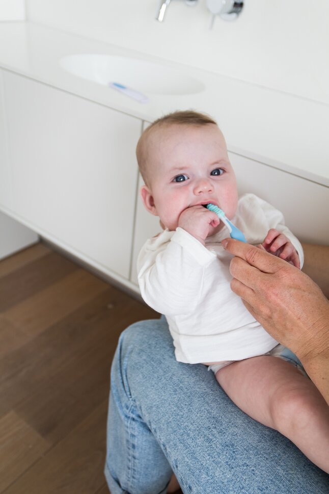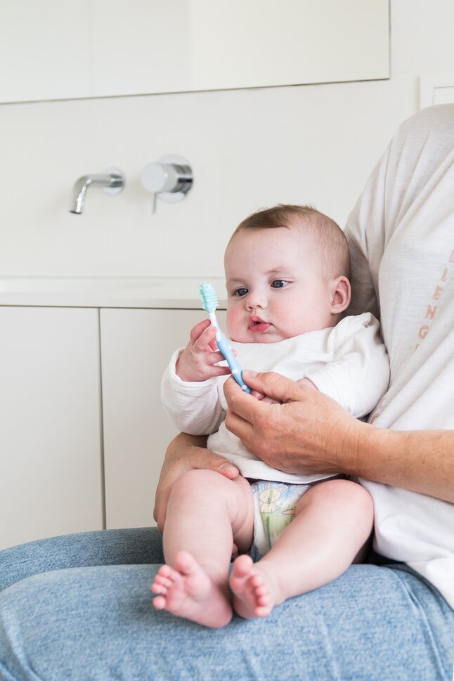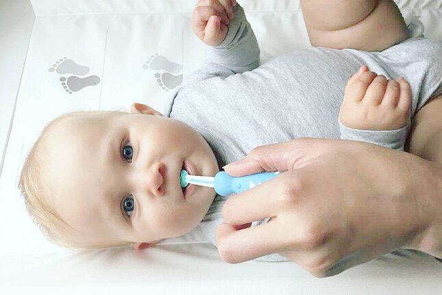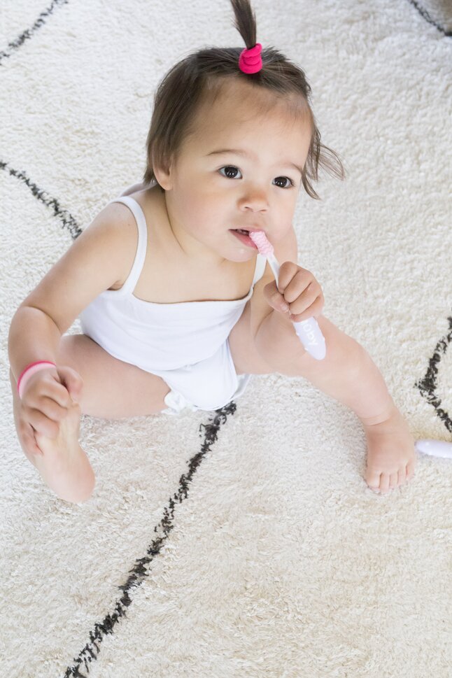 Avec 2 brosses pour masser les gencives et le palais (1 pour bébés à partir de 6 mois et 1 pour bébés à partir de 12 mois) et 1 brosse à dents ordinaire avec poils souples en nylon.