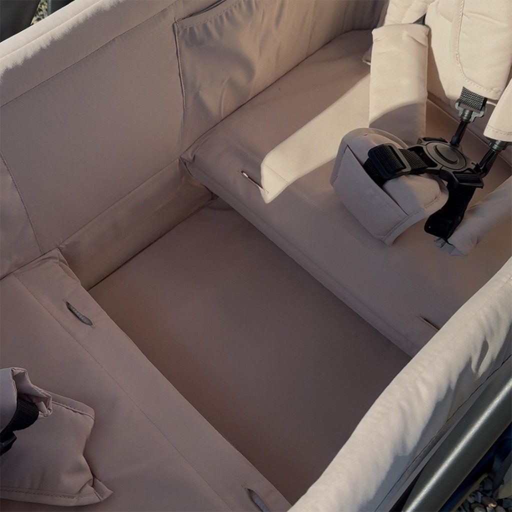 - Haal de zitjes eruit om de kindjes naast elkaar te zetten. Je kan zelf de indeling van je wandelwagen bepalen.