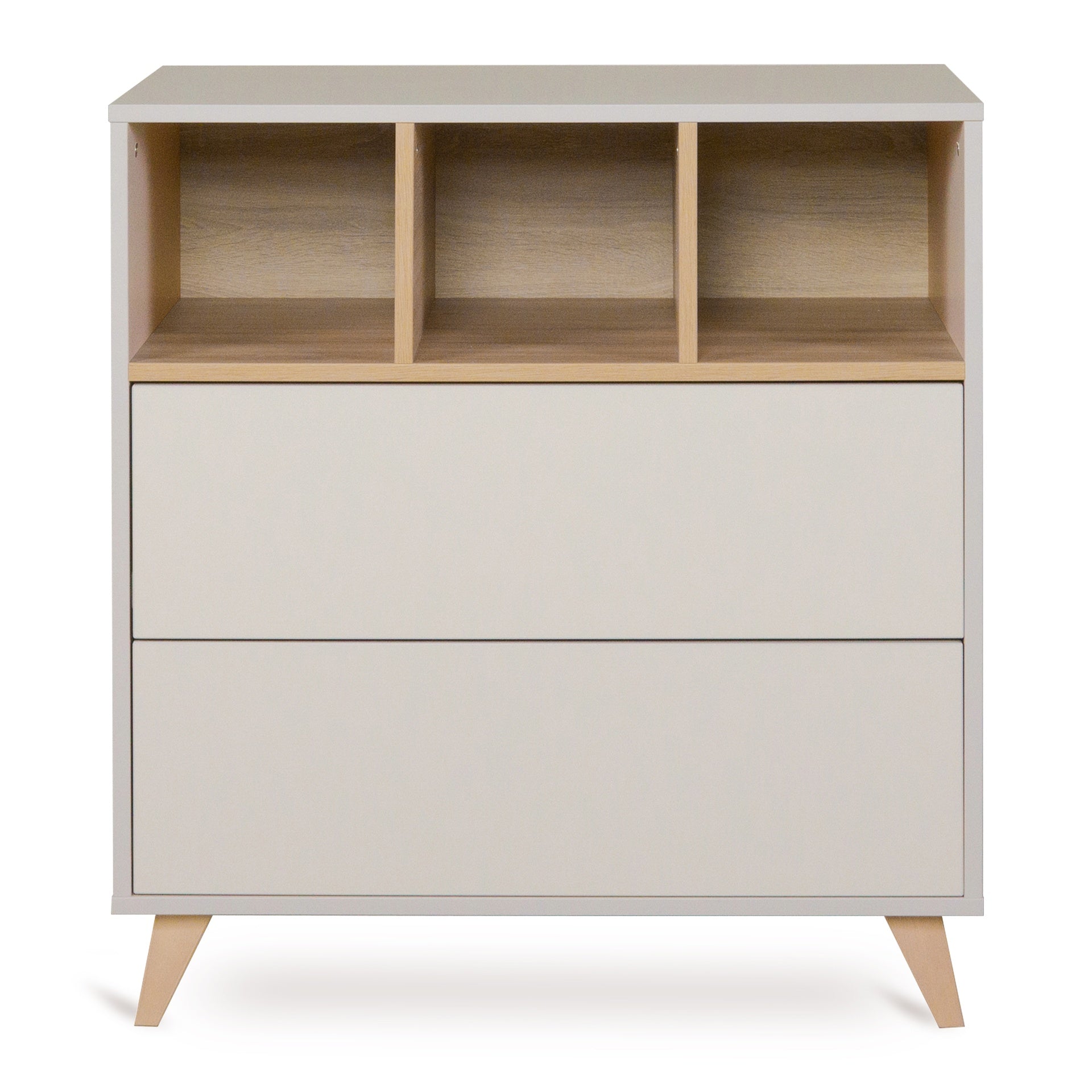 La commode se compose de 2 tiroirs avec système push et 3 espaces ouverts.