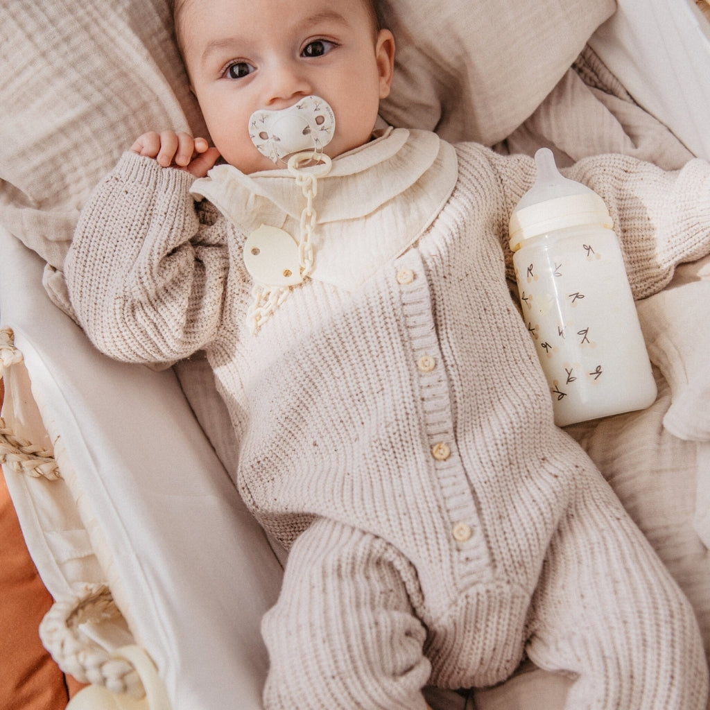 - Tétine physiologique en silicone, plate et symétrique : conçue pour respecter le développement buccal et dentaire du bébé.