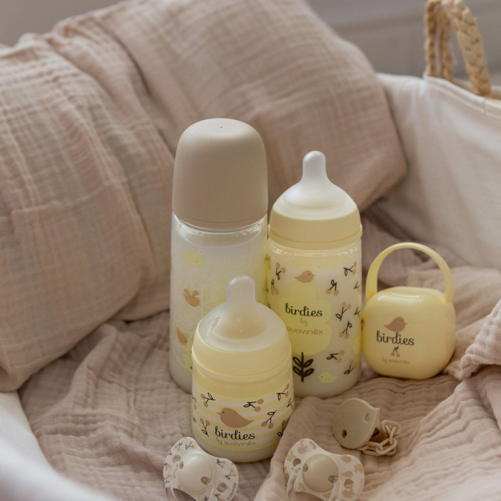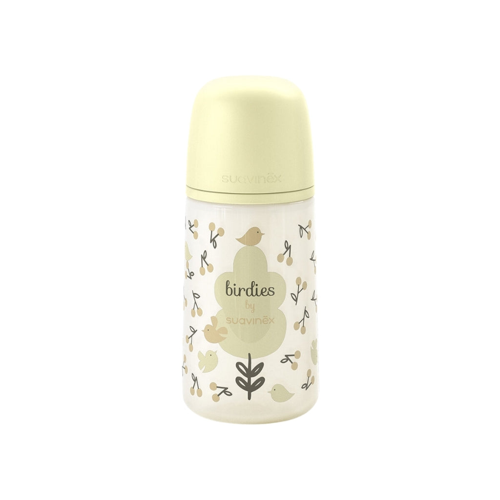 Ce biberon Birdies beige de Suavinex avec tétine physiologique SX Pro à débit moyen est parfait dès 3 mois !