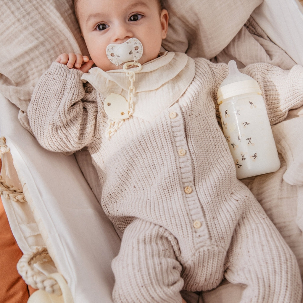 - Tétine physiologique en silicone, plate et symétrique : conçue pour respecter le développement buccal et dentaire du bébé.