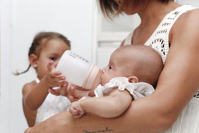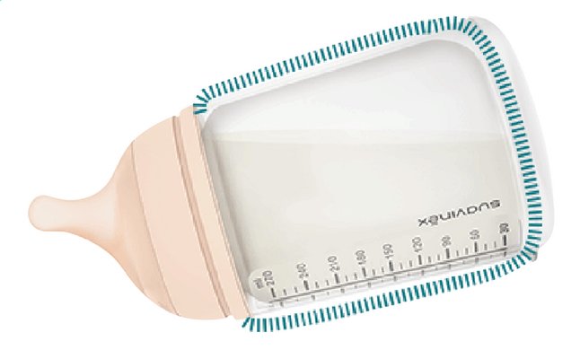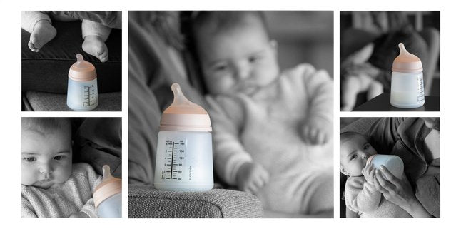 Le biberon est pourvu d'un sac anti-colique en silicone. Ce dernier se contracte dès que Bébé tète, à l'image des glandes mammaires. Il empêche à l'air de rentrer dans le lait et de créer des coliques chez Bébé.