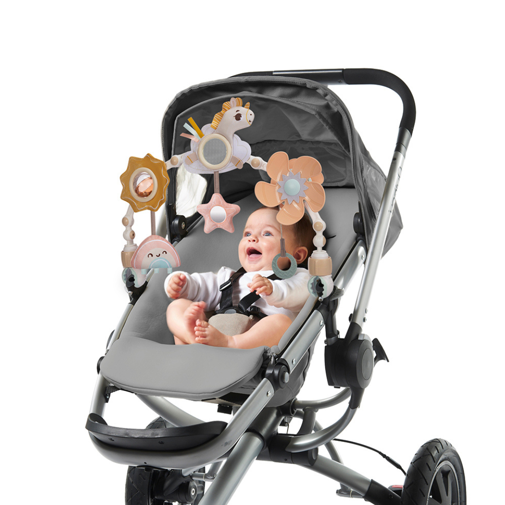 Vanaf de geboorte!- Deze speelboog past op de meeste wandelwagens dankzij de aanpasbare clips!- Ga al vanaf de geboorte op zintuiglijke ontdekking.