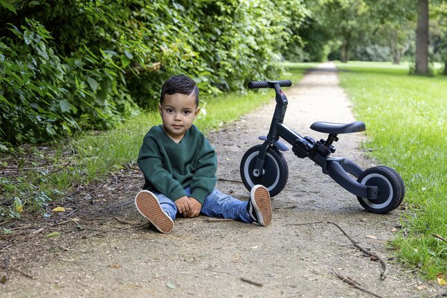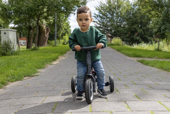 - 4 en 1 : utilisez-le d'abord comme tricycle, ensuite comme vélo en repliant les roues arrière. Les roues sont amovibles, aussi bien en mode tricycle qu'en mode vélo, et se rangent dans les encoches prévues à cet effet sous la selle.