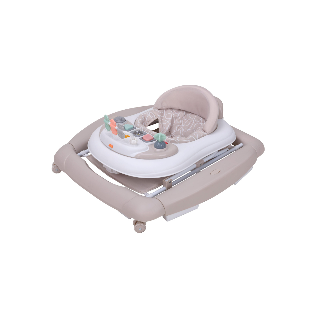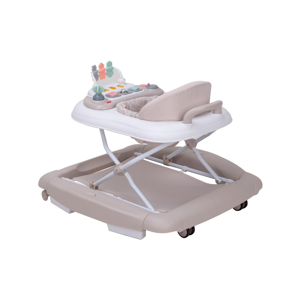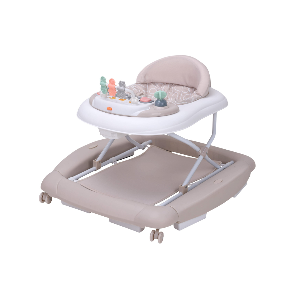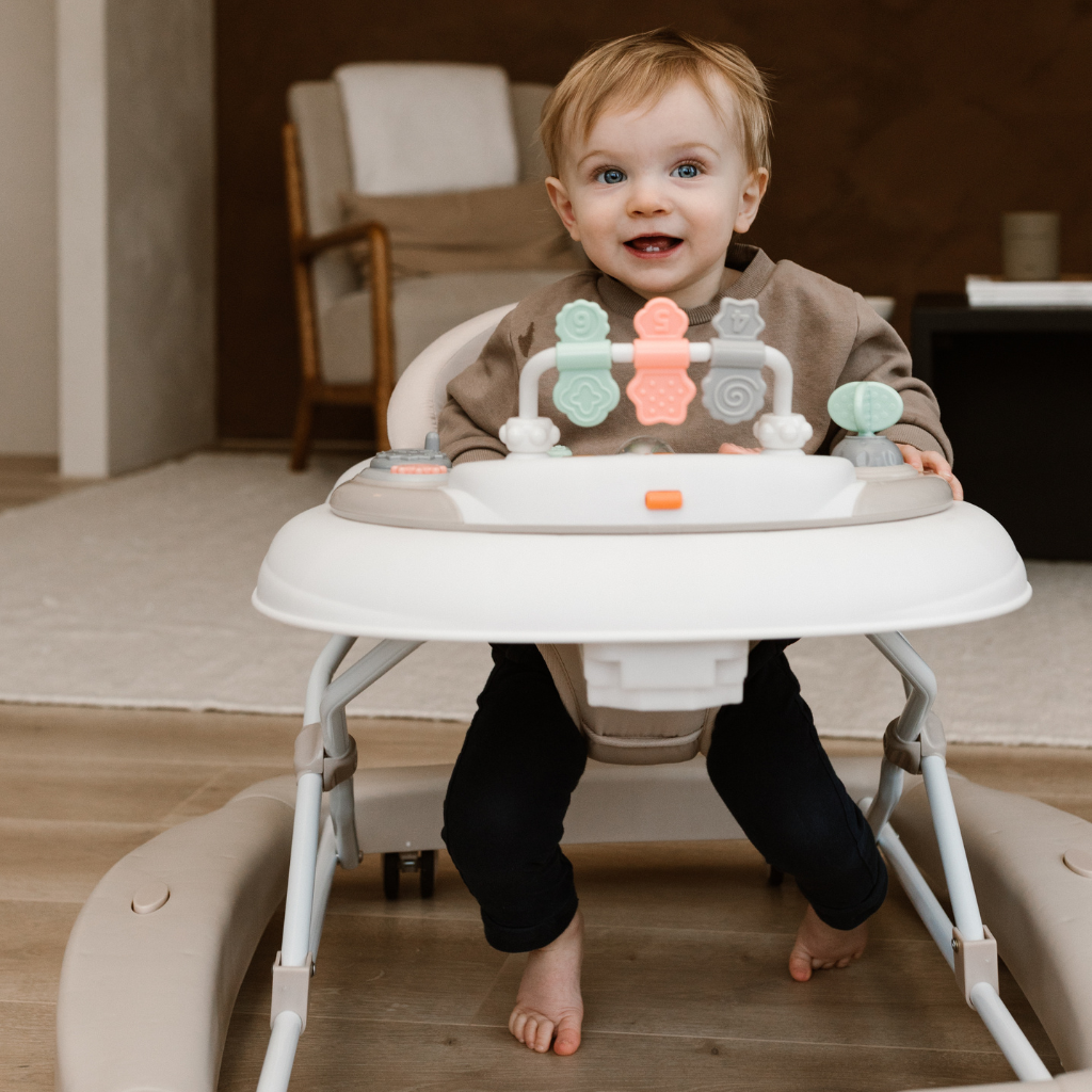 Met remmen, voetensteun en speelblad. - Loopstoeltje met 4 wielen, waarvan de voorste 2 kunnen zwenken.