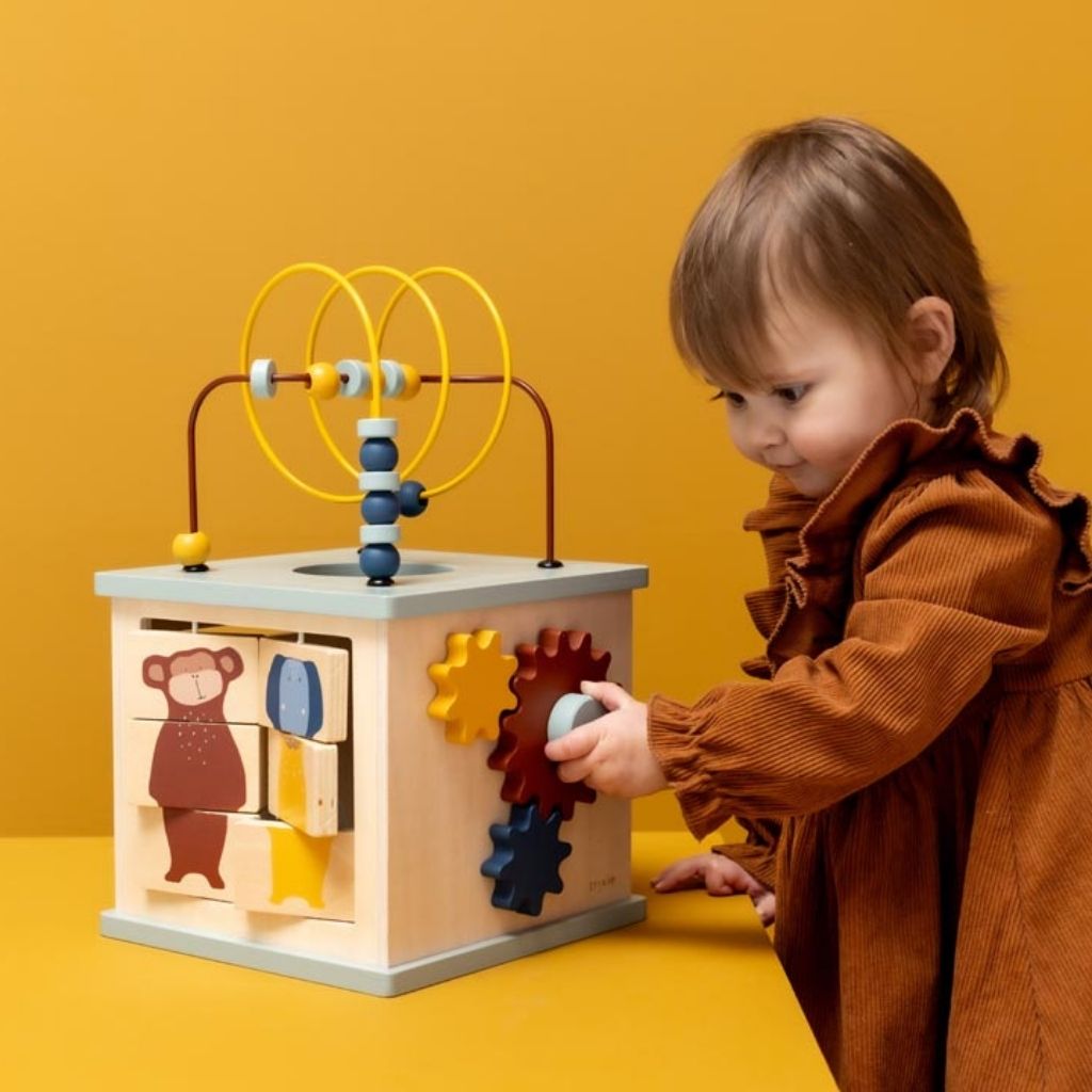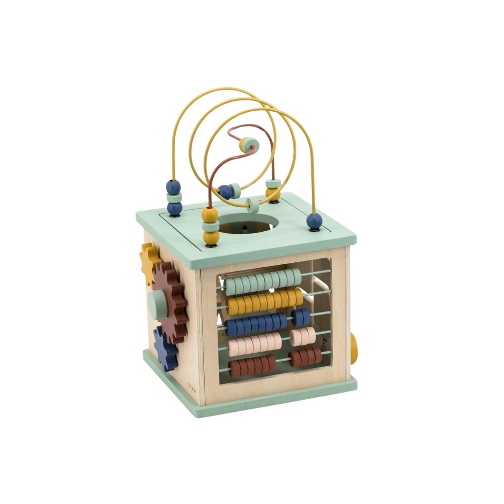 Sur le dessus, vous trouverez deux labyrinthes avec des perles colorées. Sur le côté, votre enfant pourra faire des puzzles avec ses amis les animaux. Comment ? En créant des créatures folles ou en trouvant la partie supérieure et inférieure correspondante de chaque animal. Le cube d'activités comprend également un boulier et un jeu d'engrenages.