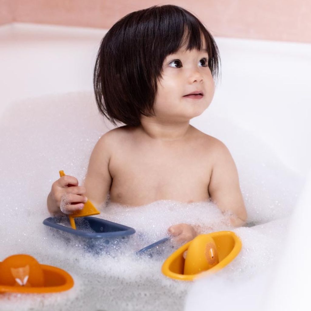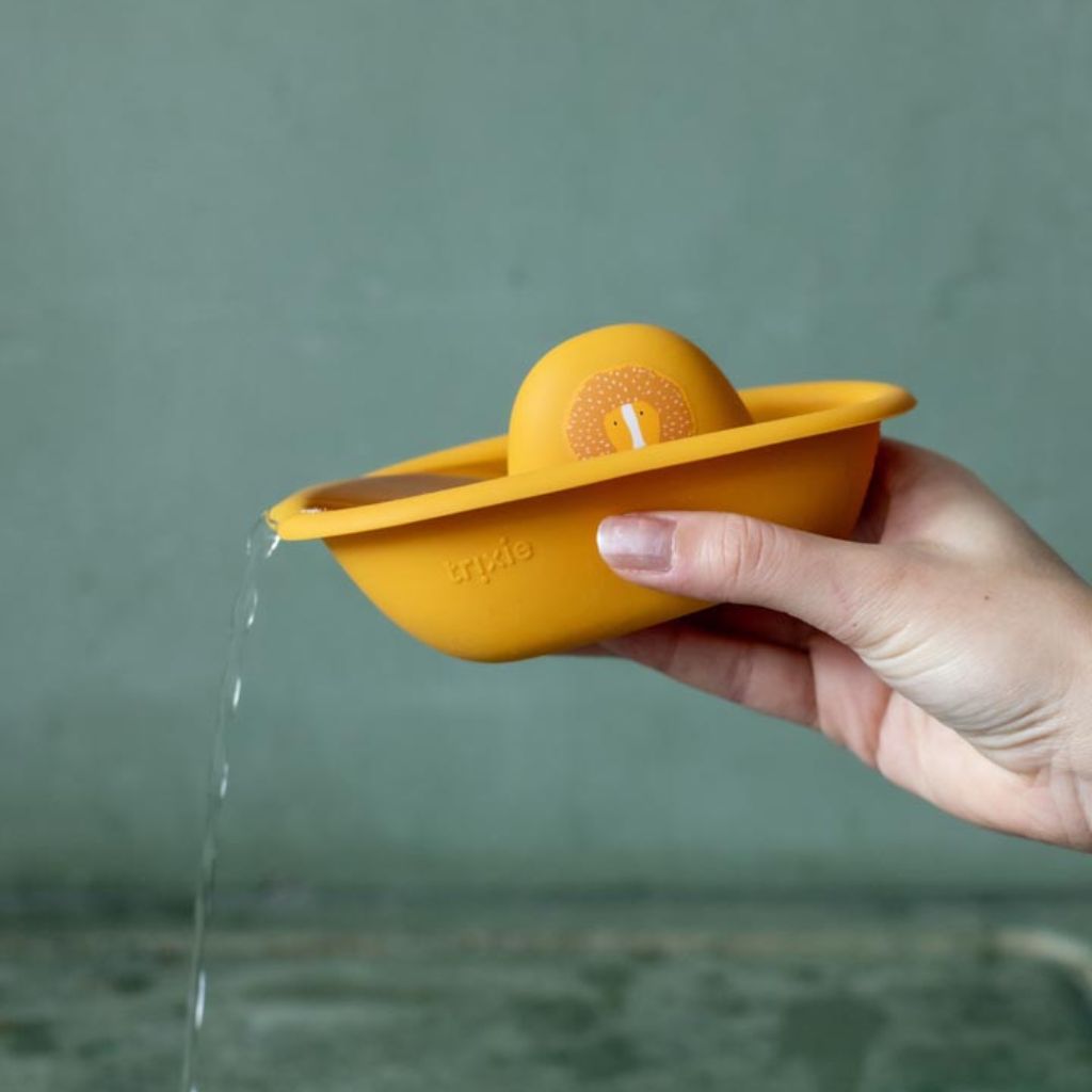 Dès 6 mois.- Bateaux à l'effigie de Mr. Lion, Mrs. Elephant & Mr. Fox.- Servez-vous-en comme gobelets pour rincer les cheveux de votre petit.