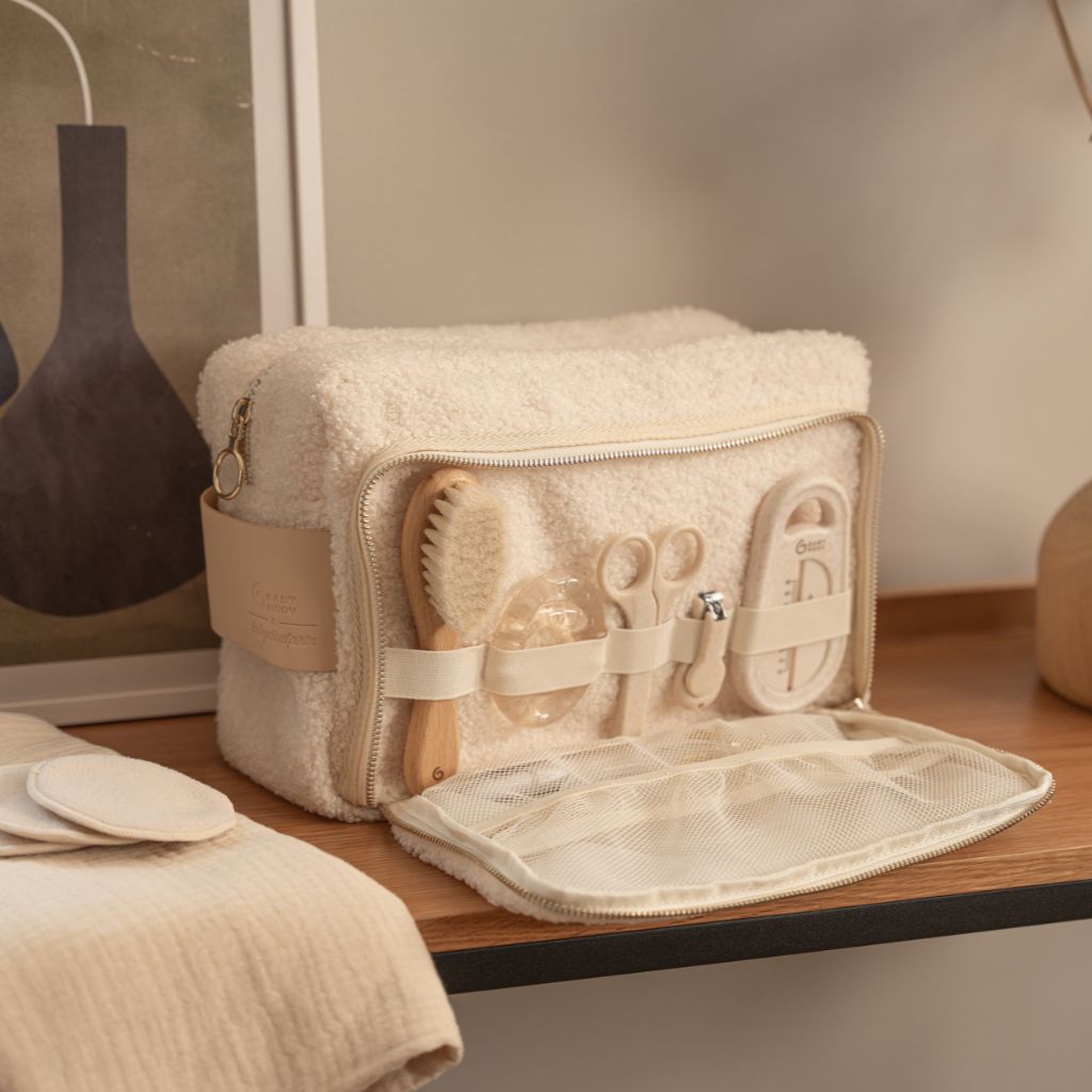 - Compleet met 11 accessoires inbegrepen : 1 dubbel geweven doek van gerecycled katoen 60 x 60 cm, 3 herbruikbare microvezel doekjes, FSC-gecertificeerde houten borstel, badthermometer, rectale thermometer, bijtring, nagelvijl, neusreiniger, nagelknipper, schaar met afgeronde punten en tandvleesmassager.