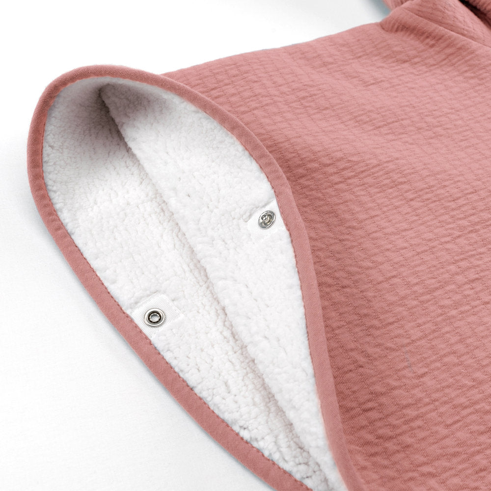 Deze warme en zachte poncho is perfect voor een wandeling in de buggy of draagzak, maar ook in de auto biedt het heel wat voordelen. Je hoeft je kindje zijn jas niet meer aan of uit te doen om hem veilig te kunnen vastmaken in de autostoel. Je kindje vastmaken met een jas aan wordt namelijk ten strengste afgeraden omwille van veiligheidsredenen.