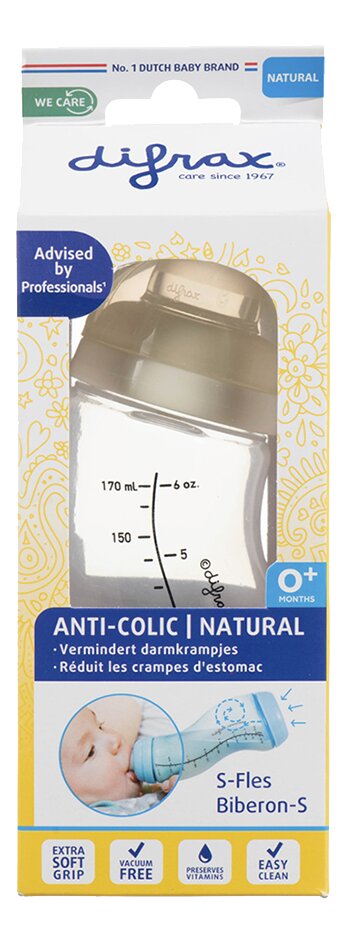 Ideaal voor combinatie flesvoeding en borstvoeding. De S-vorm en het antikoliekventiel zorgen ervoor dat de speen altijd gevuld is met melk, en niet met lucht. Zo heeft je baby minder last van krampjes, boertjes, oorpijn... De S-zuigfles Natural Popcorn is vanaf de geboorte te gebruiken en is ideaal in combinatie met borstvoeding. Inhoud: 170 ml. Geschikt voor de vaatwasmachine, microgolfoven, sterilisator en flesverwarmer.