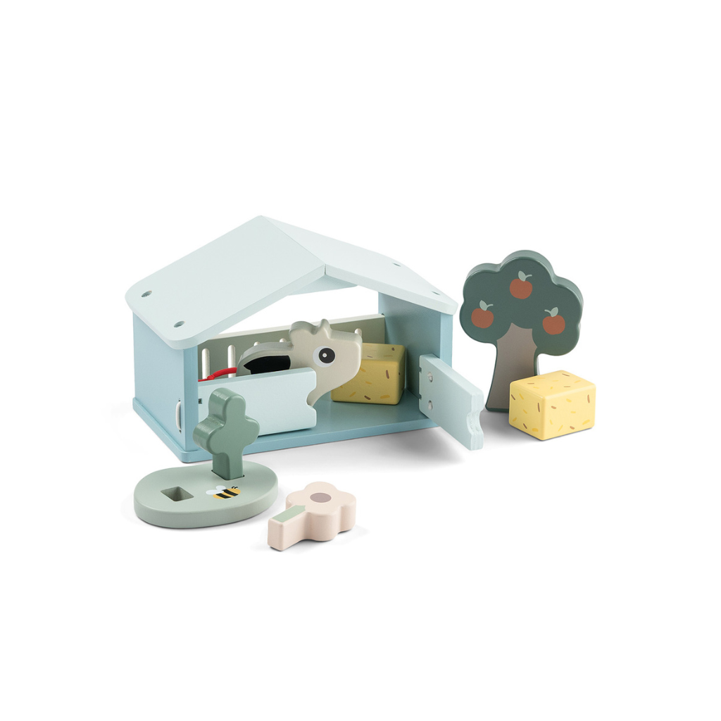 - Tiny Farm Dotti: stal met een koe, bomen en hooi.