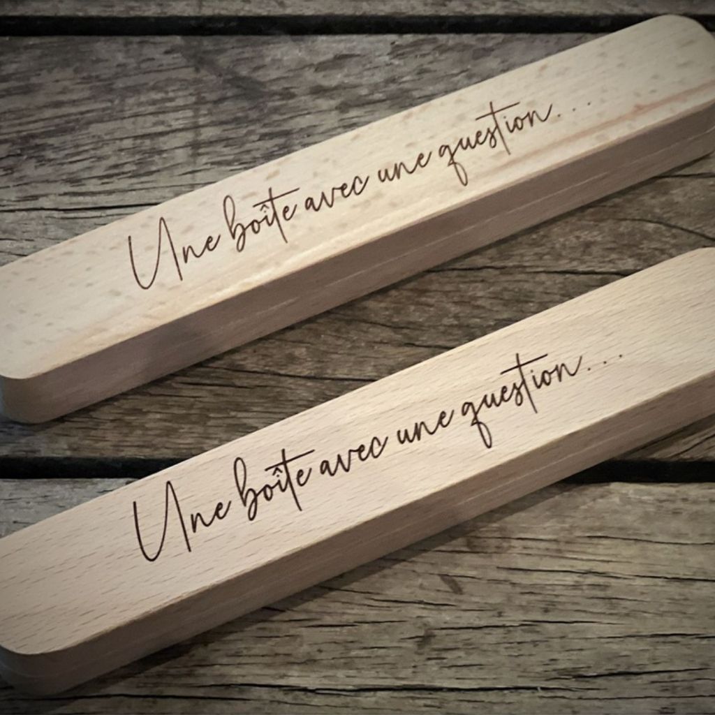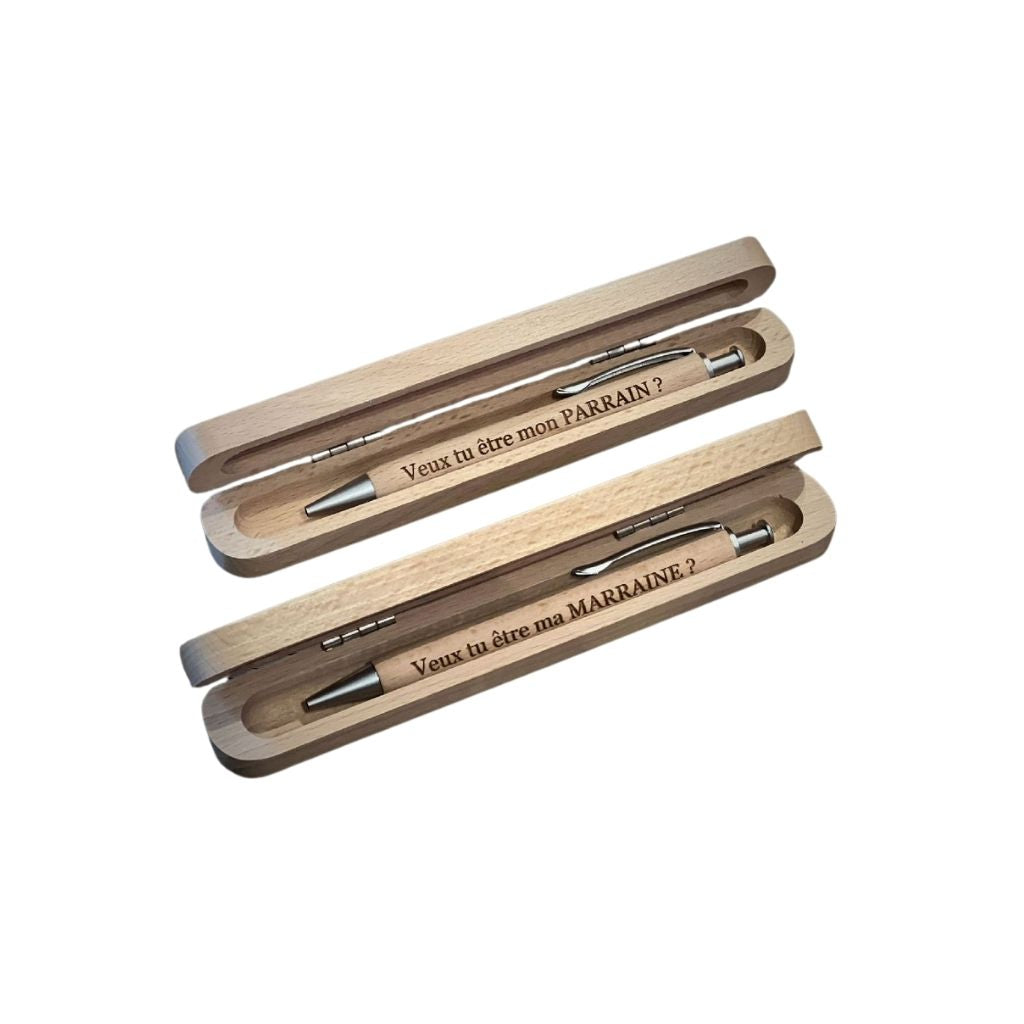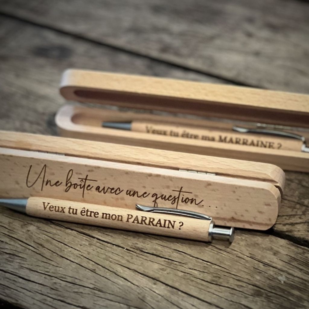 Bevat een doos "avec une question" en een balpen "Veux-tu être ma marraine?".