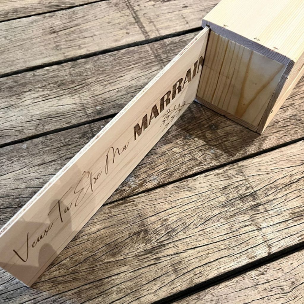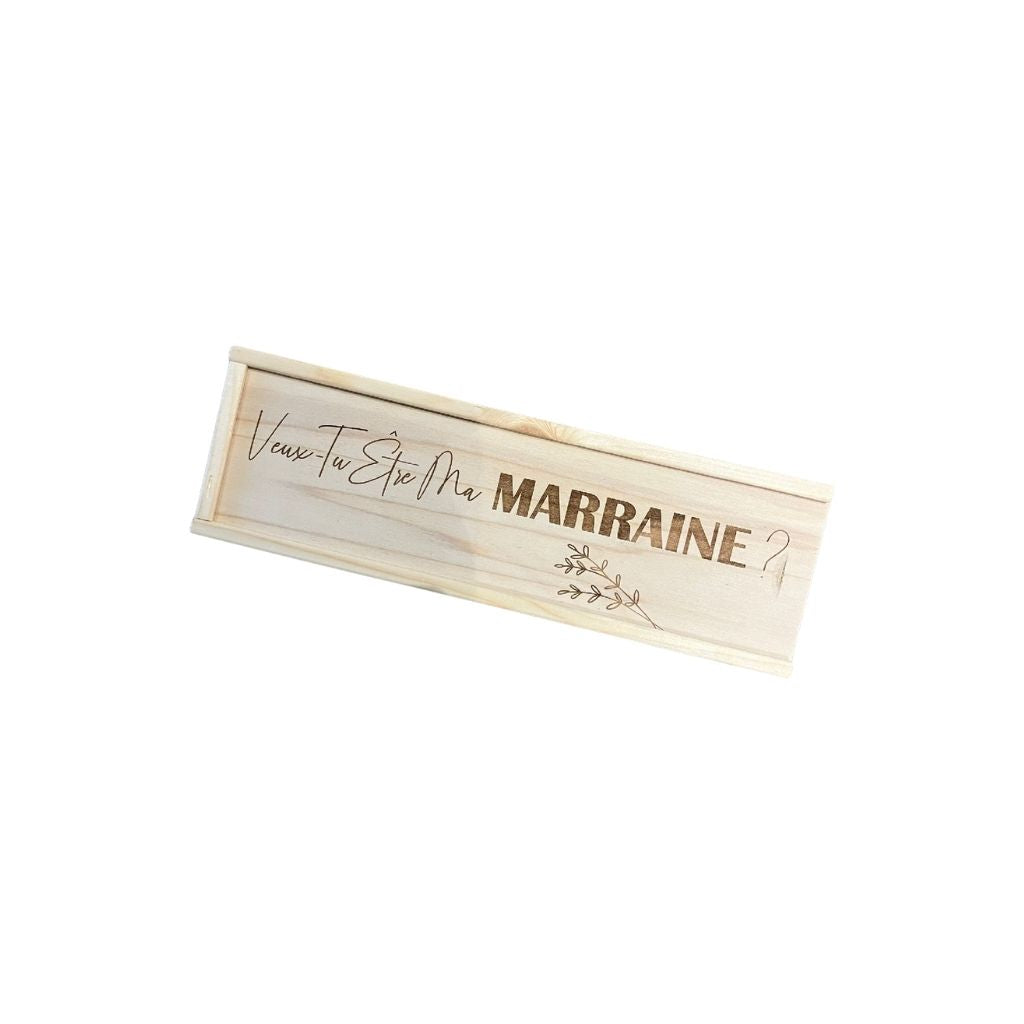 Frans.Met dubbelzijdige afdruk: aan één kant van het deksel staat "Une boîte avec une question...", aan de andere kant van het deksel staat "Veux-tu être ma marraine?". In de kist past een fles wijn, likeur of sterke drank van standaardformaat.
