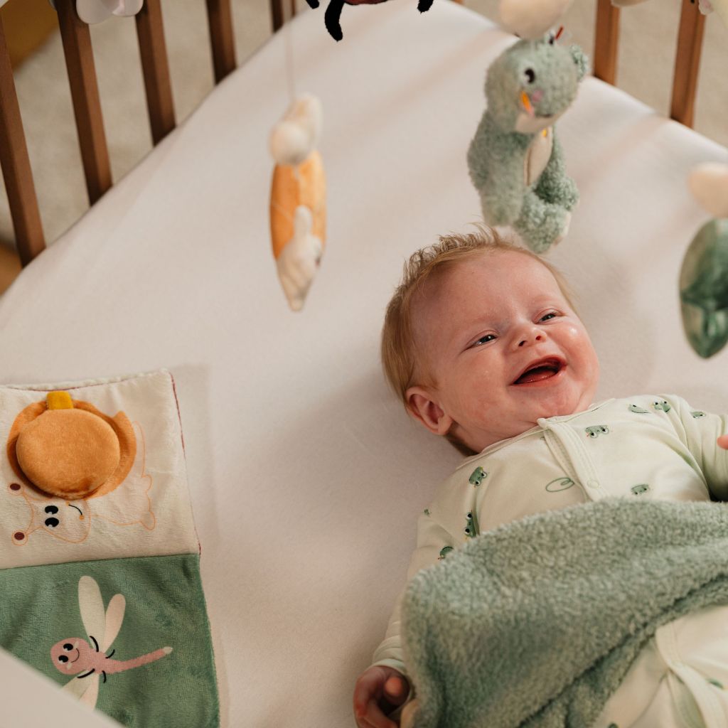 Stimuleert de zintuigen. - Met een spiegeltje, vrolijke figuurtjes uit de vijver, raampjes die je open en dicht kan doen, heel wat texturen die je kan ontdekken...
