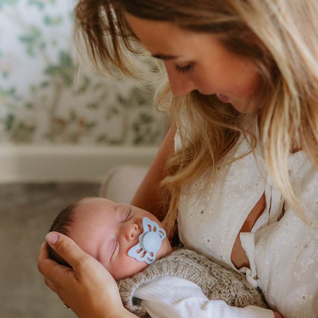 Ideaal als geboortecadeau!- Het schildje is voorzien van luchtgaatjes. Zo kan de lucht vrij circuleren en heb je minder kans op huidirritatie.- De speen imiteert de tepel: past zich aan aan het gehemelte van je kindje. Stimuleert de ontwikkeling van het gehemelte en de mond- en kaakspieren.