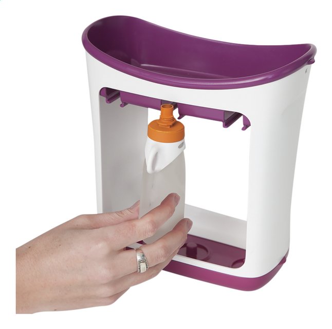 Met bevestiging voor wandelwagen of tas. Dit knijpflesje maakt het voor je baby makkelijker om zijn groente- of fruitpapje op te eten. Om het te vullen, verwijder je het deksel en bevestig je het aan de vulmachine van Infantino.