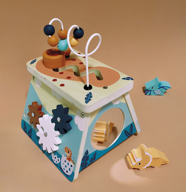 - Met verschillende activiteiten: vormsorteerder, tandwieltjes, spiegeltje, doolhof en telraam.