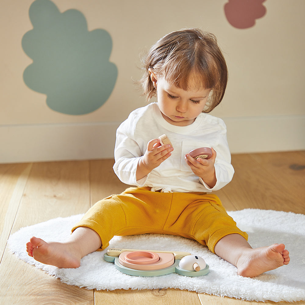 Bevordert de motoriek, het zicht & de tastzin. - 6 stukjes om in elkaar te zetten als een puzzel, waaronder 4 sensorische blokken.- 1 stukje met een spiegeleffect & 3 stukjes met reliëftexturen (puntjes, golfjes en strepen).- Gemaakt uit FSC-gecertificeerd hout.