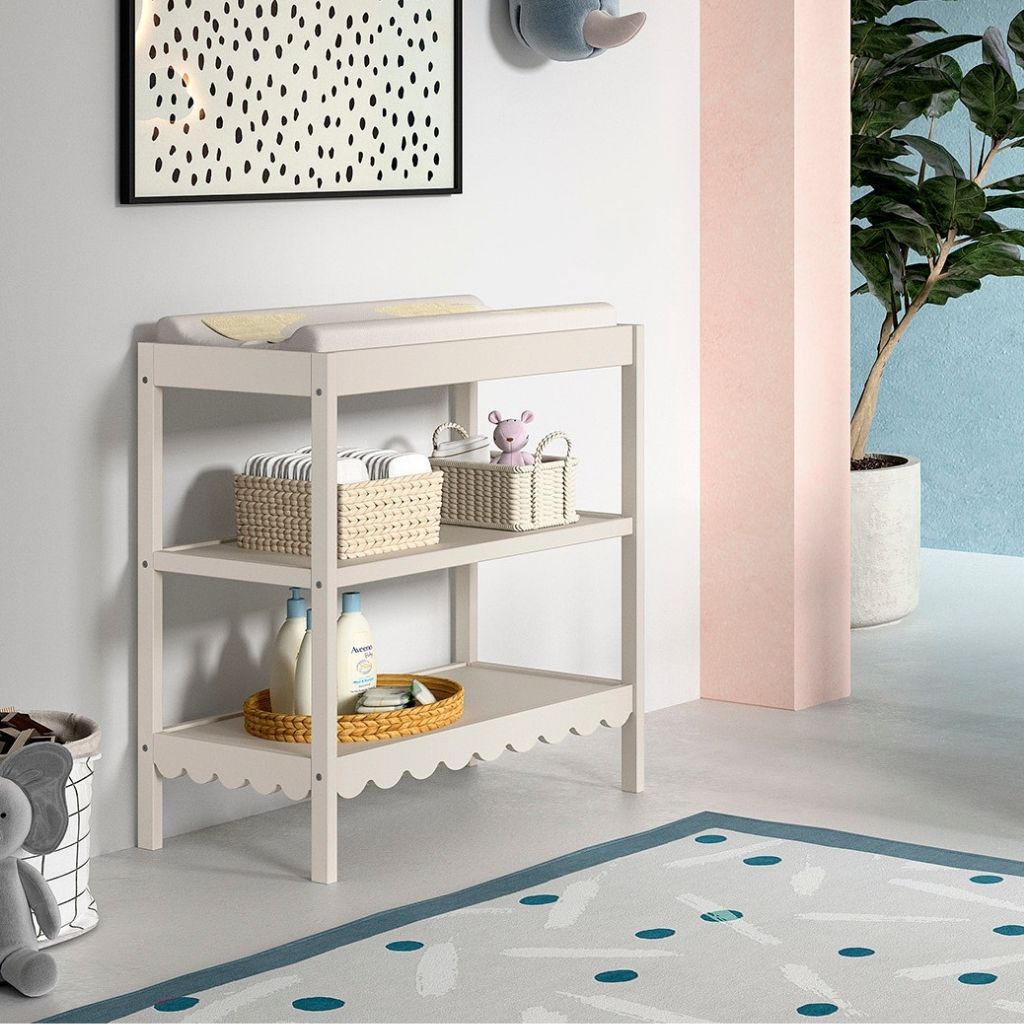 Ontdek de JAXX Swingo Verzorginstafel in Clay: strak design met speelse golfrand, inclusief handige opbergplanken. Perfect voor elke babykamer.