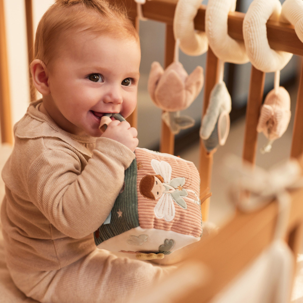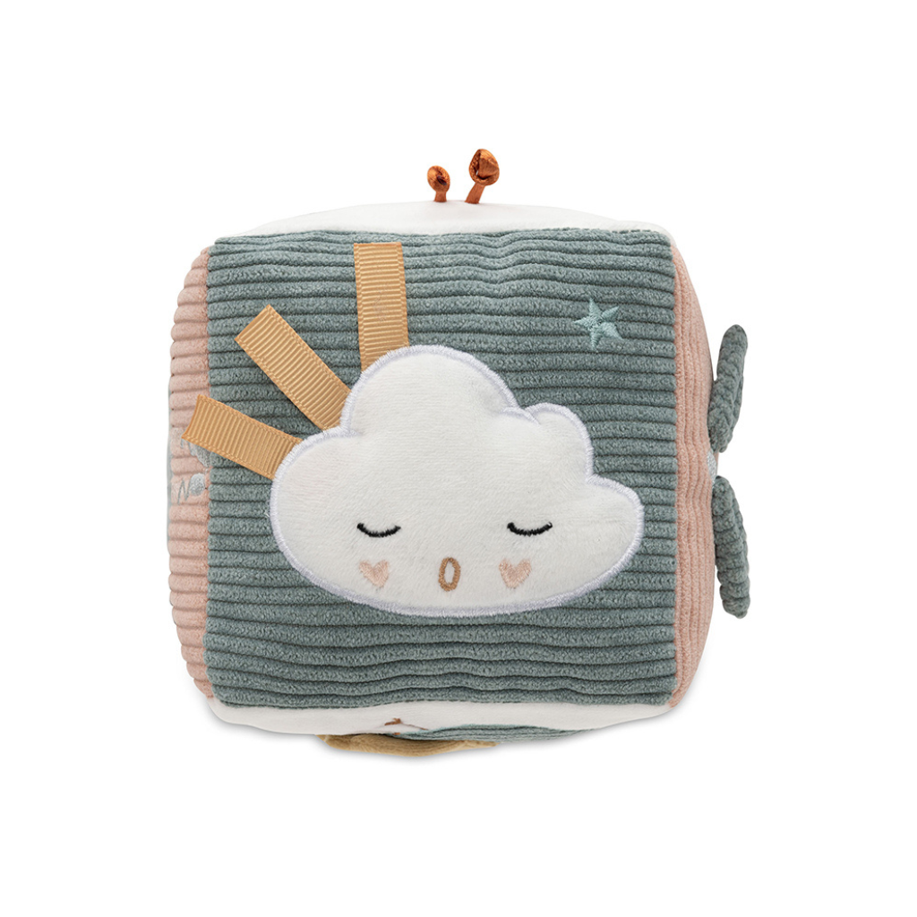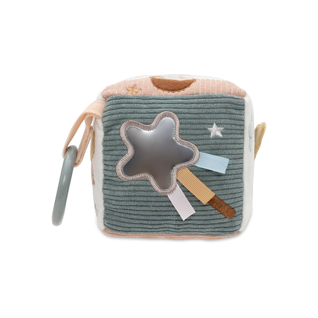 - Met een bevestigingsring: zo kan je de kubus gemakkelijk aan je wandelwagen, autostoel... bevestigen.