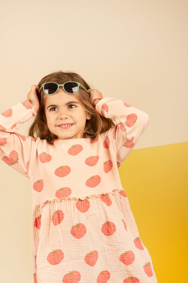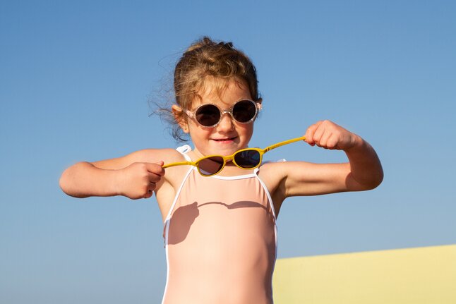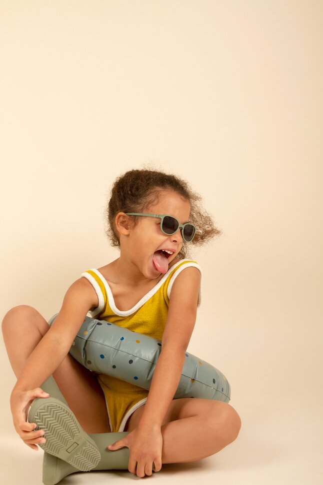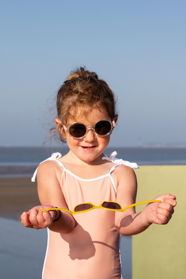 Deze zonnebril past zich aan de gezichtsvorm van je kindje aan en is ergonomisch, licht en onbreekbaar.