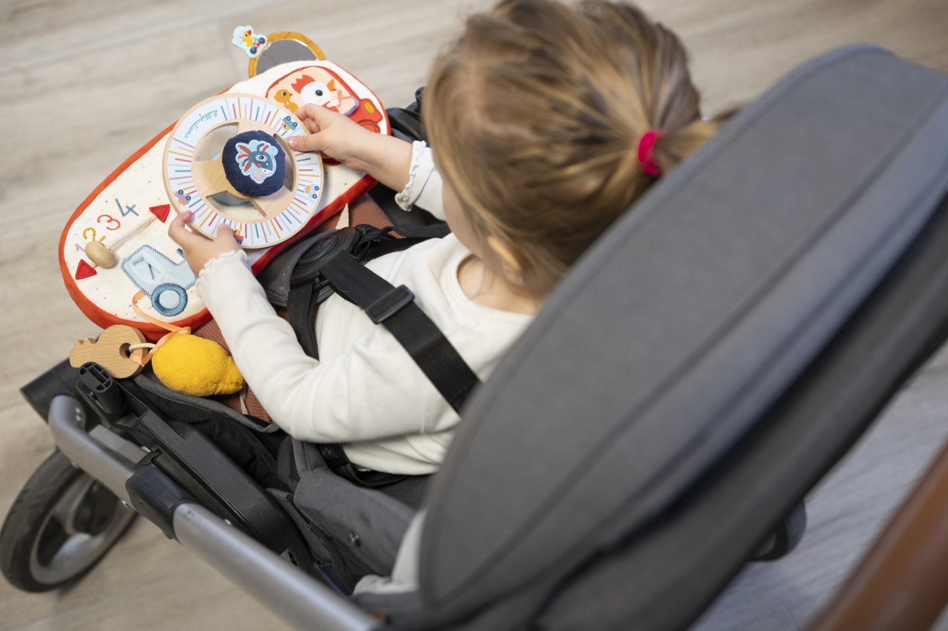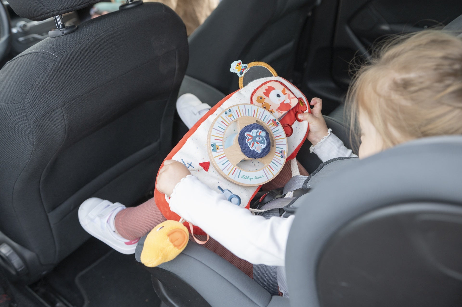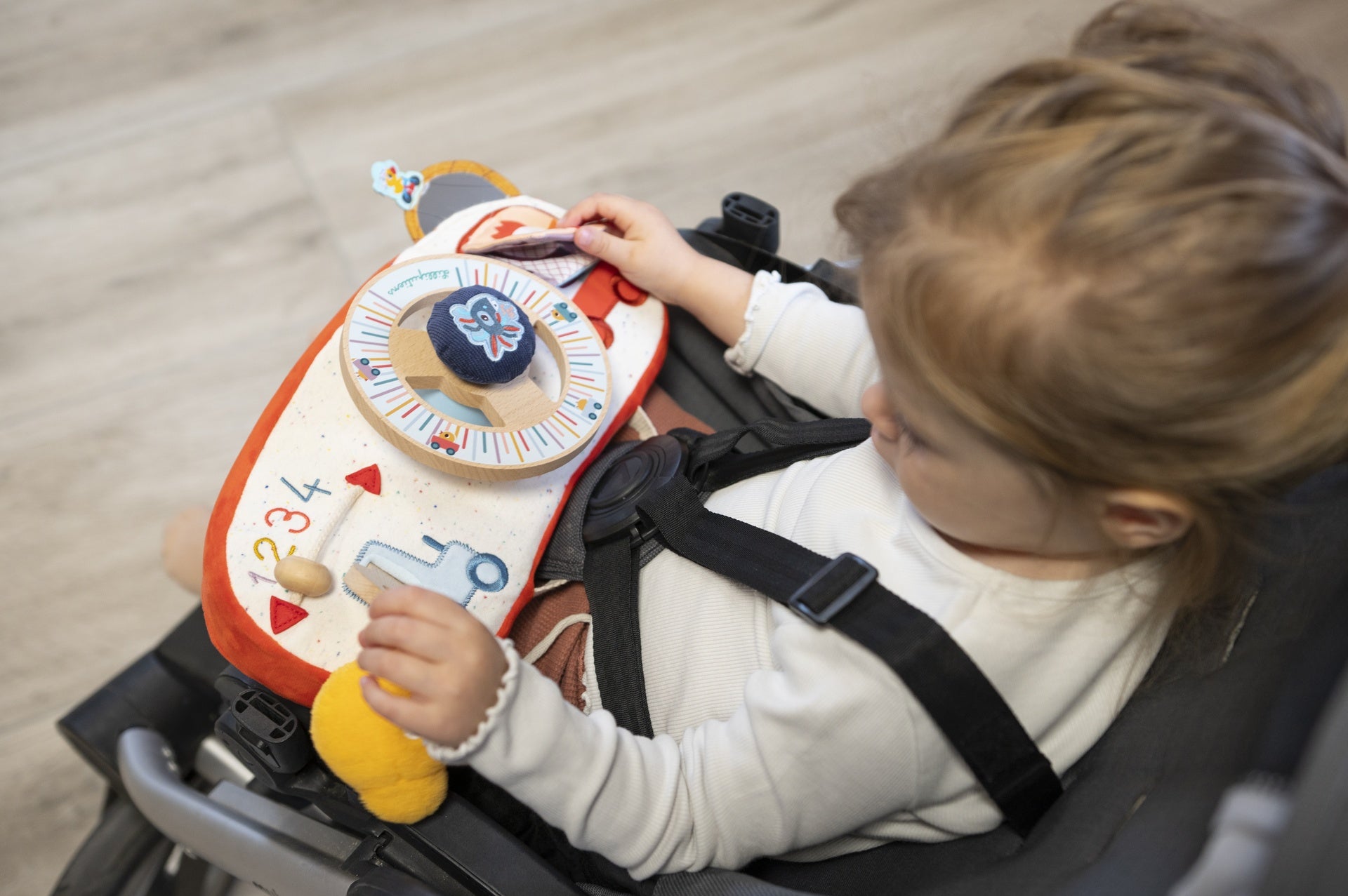 Stimuleert de zintuigen, het denkvermogen en de motoriek. - 1 stuurwiel met toeter.- 1 houten sleutel.- 4 versnellingen: pas op voor te hard rijden!- 1 achteruitkijkspiegel.- 1 verstoppertje met Paulette en haar kuikens, Rosalie en Yvon het schaap.- Makkelijk te bevestigen aan de gordel van de kinderwagen of autostoel.