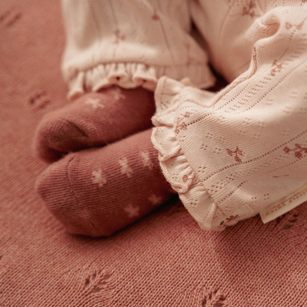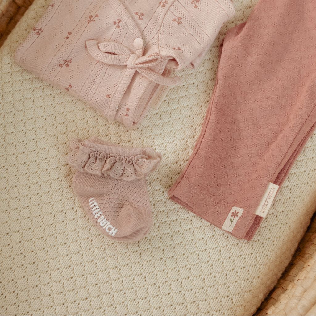 -3 paar sokken: 1x Pink Blush met kleine bloemetjes op, 1x wit met een bloemetje erop & 1x lichtroze met franjes.
