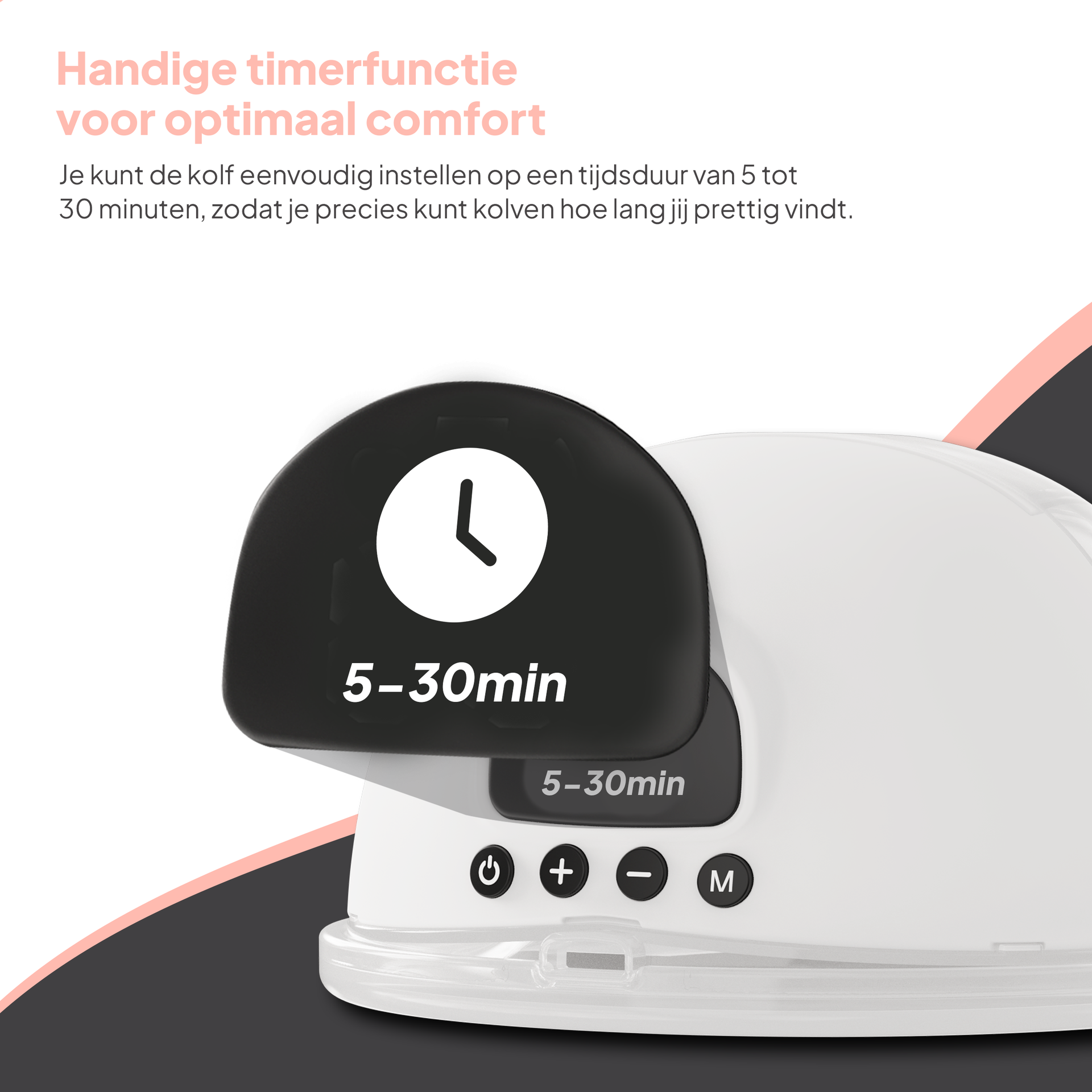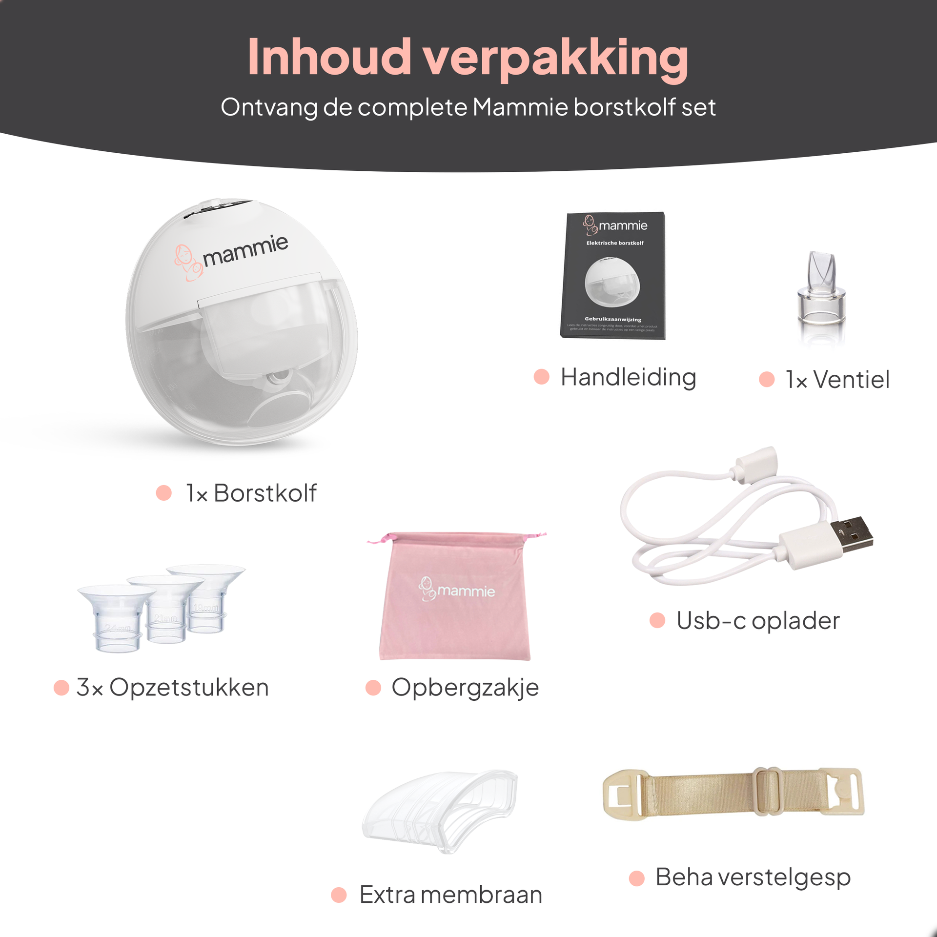 BPA-vrij. - Draadloos & handsfree: kolf wanneer je wilt, waar je wilt.- Elektrische borstkolf oplaadbaar met behulp van een USB-kabel (inbegrepen).- Borstkolfmodus: hiermee kun je moedermelk afkolven (9 mogelijke snelheden).- Massagemodus: verlicht pijn in de borst, bevordert de bloedsomloop en de melkproductie (9 mogelijke snelheden).- Stimulatiemodus: imiteert het zuigritme van je baby om de melk beter te kunnen afkolven (9 mogelijke snelheden).- Geheugenstand: de laatst gebruikte stand wordt automatisch geactiveerd.- Handige timerfunctie: kies de tijd die jou het beste uitkomt tussen 5 en 30 min.- Optimaal comfort: het borstschild past zich aan de vorm en grootte van je tepel aan.- 4 maten tepelbeschermers beschikbaar: 27 mm, 24 mm, 21 mm en 19 mm.- LCD-scherm: om alle instellingen in één oogopslag te zien.- Gemakkelijk te gebruiken en schoon te maken.- Lekvrij!- Behoudt de kwaliteit van de moedermelk.- 100 % veilig voor jou en je baby.- CE-gekeurd.- BPA-vrij.Wat zit er in de doos?- 1 x Mammie enkele elektrische borstkolf- 1 x siliconen ventiel- 1 x siliconen tepelhoedje (27 mm)- 3 x kleinere tepelhoedjes (24, 21, 19 mm)- 1 x extra membraan- USB-oplaadkabel- adapter voor bh - opbergetui