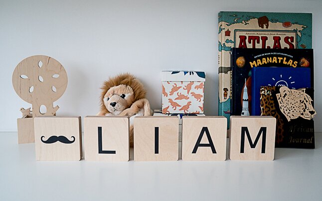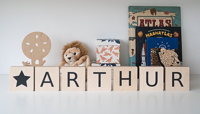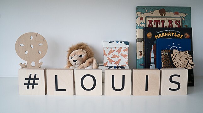 Hang de letters op met dubbelzijdige tape, kleefpads, etc. of geef ze een leuke plaats op de commode of het wandrek.