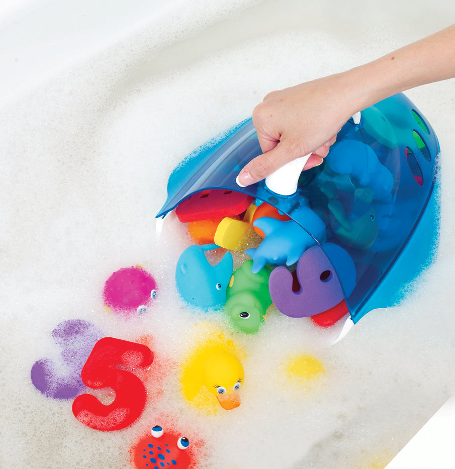 Grote capaciteit. - Makkelijk speelgoed uit het bad halen</bold>: schep ontworpen om speelgoed gemakkelijk uit het bad te vissen.- Grote capaciteit: kan meerdere speeltjes tegelijk bevatten.- Getint en transparant bovendeel.- Snelle waterafvoer: gaten in de bodem van de badschep laten het water snel weglopen. Zo stagneert het water niet en blijft het speelgoed schoon en droog.- Handige montagebeugel: wordt geleverd met een montagebeugel. Gemakkelijk te bevestigen aan de rand van het bad met de meegeleverde plakstrips.- Praktisch opbergen: niets blijft rondslingeren in bad!