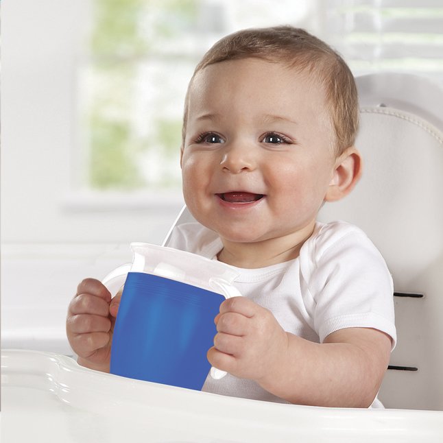 Je kindje kan overal aan de oefenbeker drinken, zonder te knoeien of morsen.