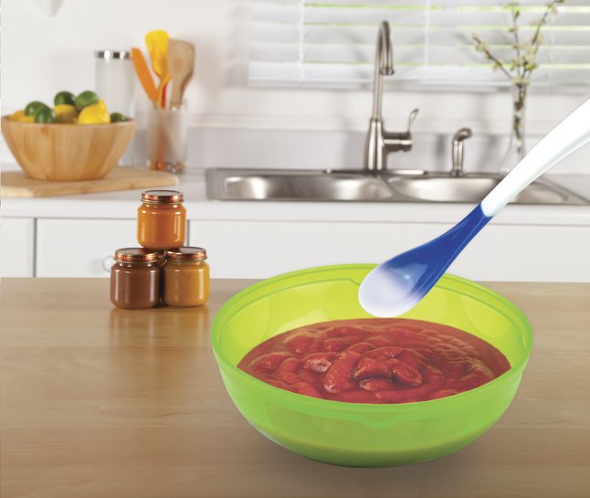 L 21.5 cm. Voor kindjes van 3 maanden of ouder. De verandering in temperatuur is zichtbaar wanneer het eten warmer is dan 40° C.