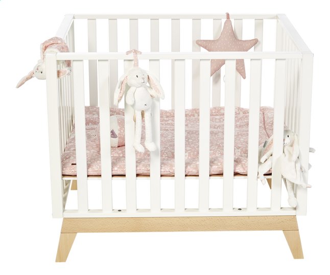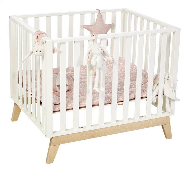 Van massief beukenhout. De bodem van het park is verstelbaar in 3 standen. Is je baby nog klein, dan kan je het park op de hoogste stand zetten. Zo leg jij je baby makkelijk neer zonder je te diep te bukken. Als je kindje groter en actiever wordt, kan je de bodem verlagen, zodat je actieve speelvogel veilig in het park kan spelen.