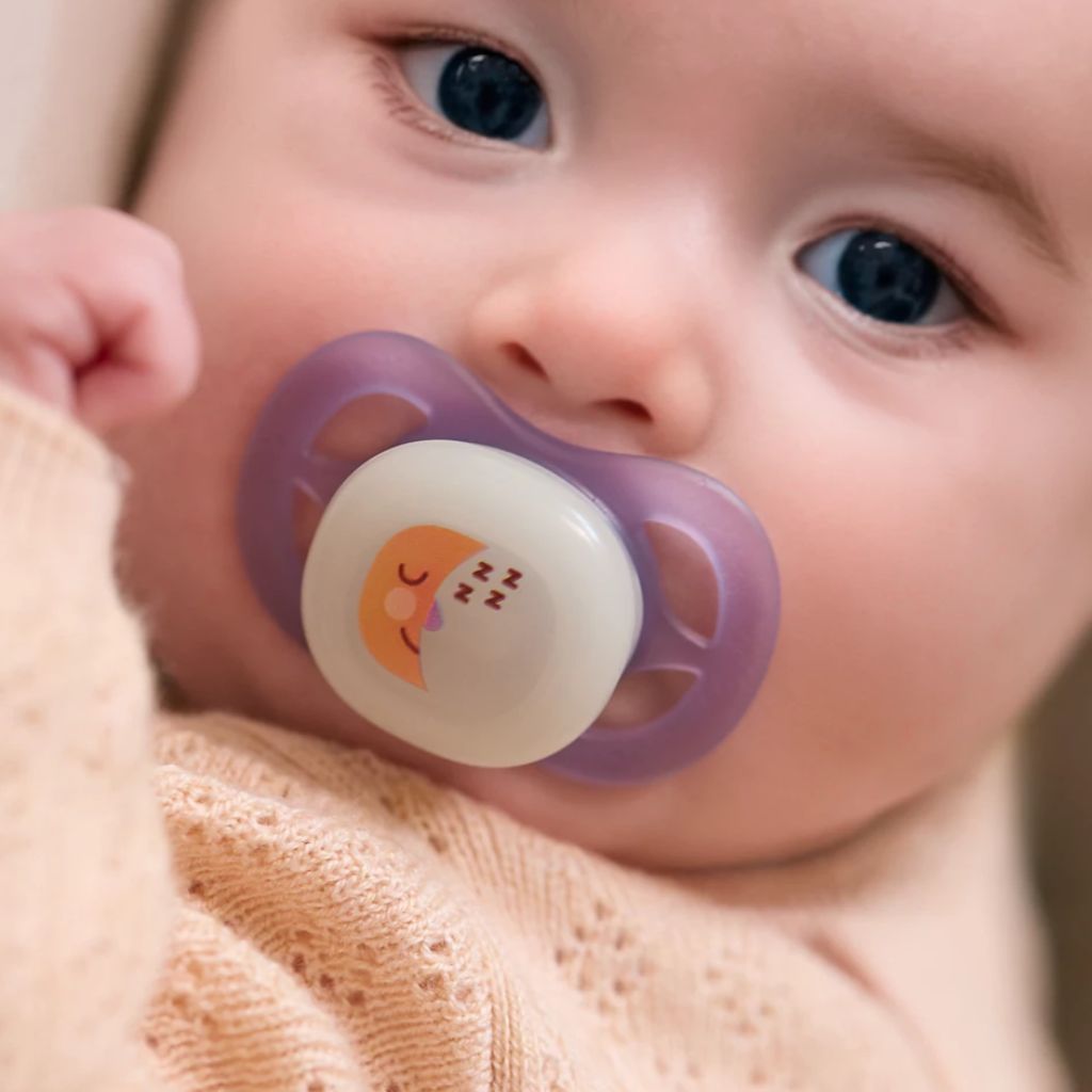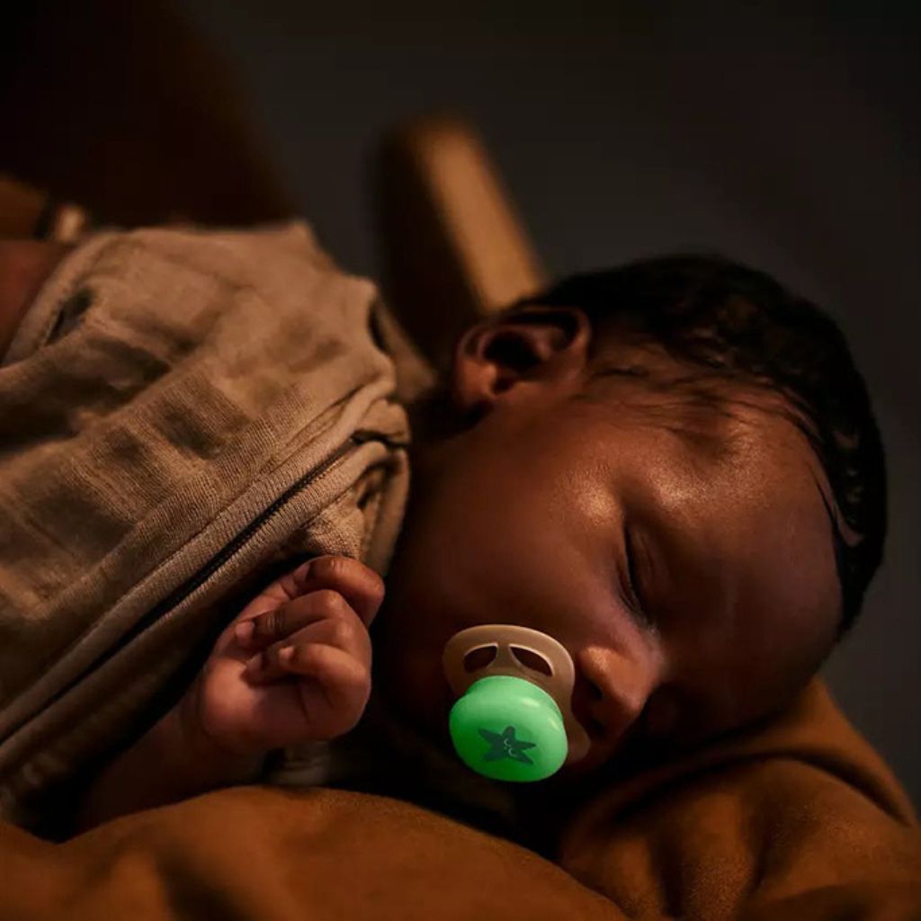 Set van 2 fopspenen die licht geven in het donker!Deze 2 fopspenen hebben een zachte, orthodontische siliconenspeen die je kleintje comfort biedt. De speen is symmetrisch en respecteert de natuurlijke vorm van het gehemelte, de tanden en het tandvlees van je baby, zodat de mondontwikkeling wordt gerespecteerd.Het schildje geeft licht in het donker: zo vind je de speen makkelijk terug, zonder het licht te moeten aansteken.De speen is gemaakt uit voedselveilige siliconen, 100% vrij van BPA, BPS, ftalaat, PVC en polycyclische aromatische koolwaterstoffen.Je kunt de fopspeen steriliseren en opbergen in het praktische doosje.