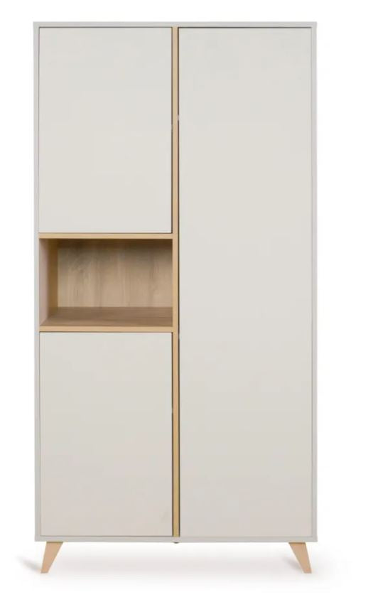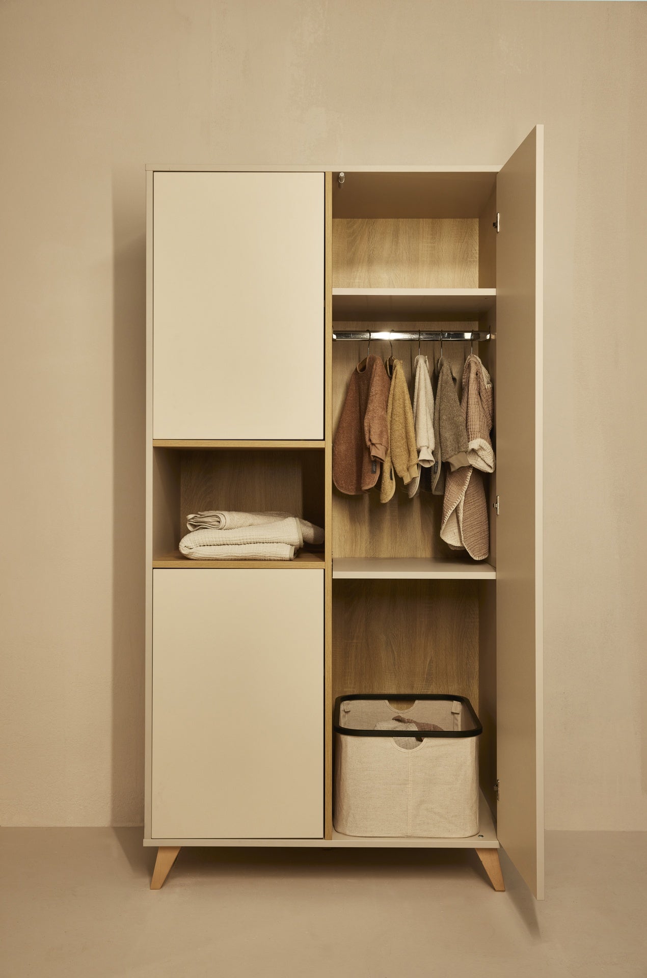 De kast is uitgerust met drie vaste legplanken, drie verstelbare legplanken en een kledingstang.