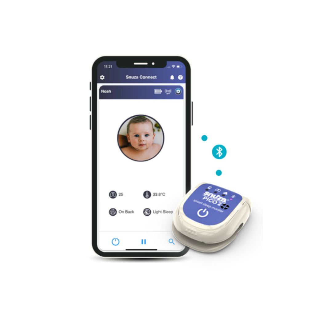 Bewaak je baby's ademhaling met de Snuza Pico 2 ademhalingsmonitor. Download de Snuza Connect-app en volg realtime mee vanaf je smartphone: monitor onder meer lichaamstemperatuur, lichaamshouding en slaappatroon.