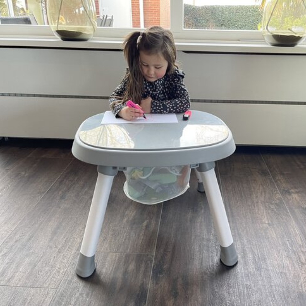 Het zitje draait 360 °. Het tafeltje kan aangepast worden naargelang de leefijd van je kleintje.