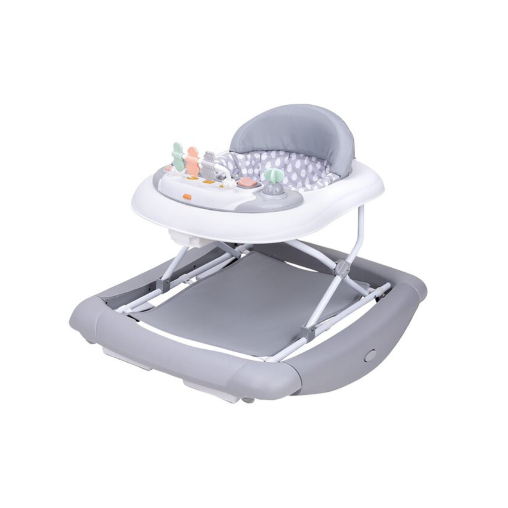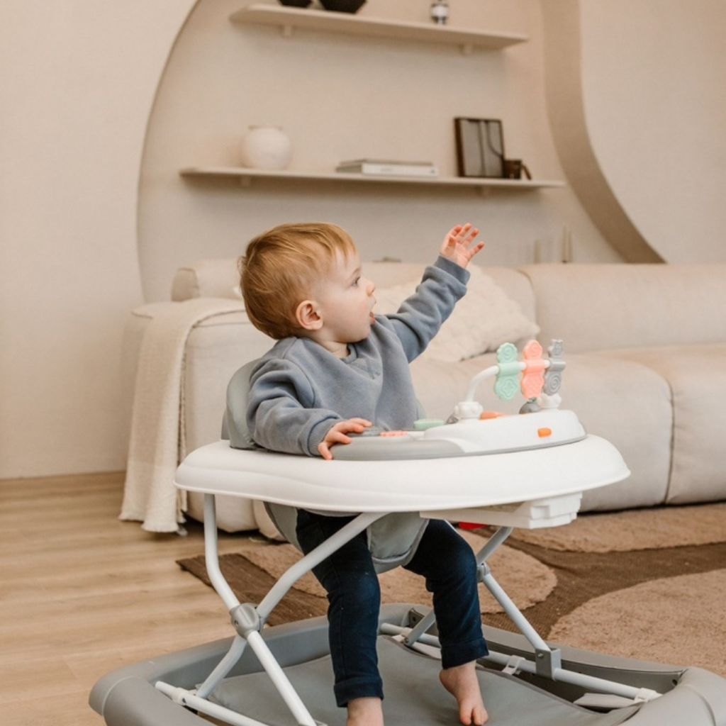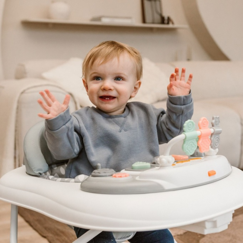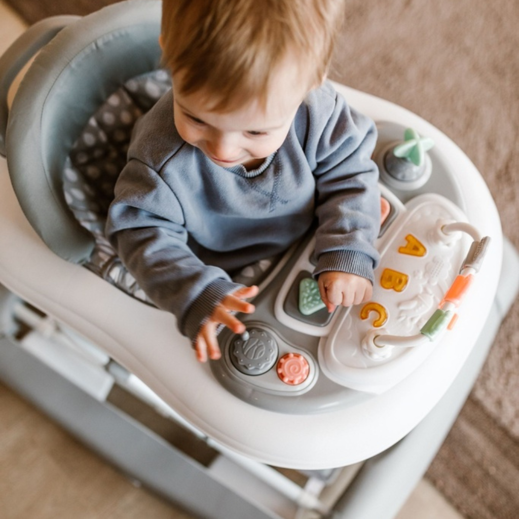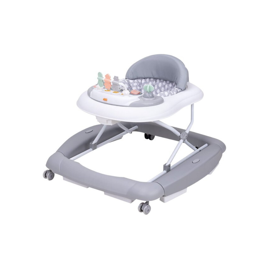 Met remmen, voetensteun en speelblad. - Loopstoeltje met 4 wielen, waarvan de voorste 2 kunnen zwenken.
